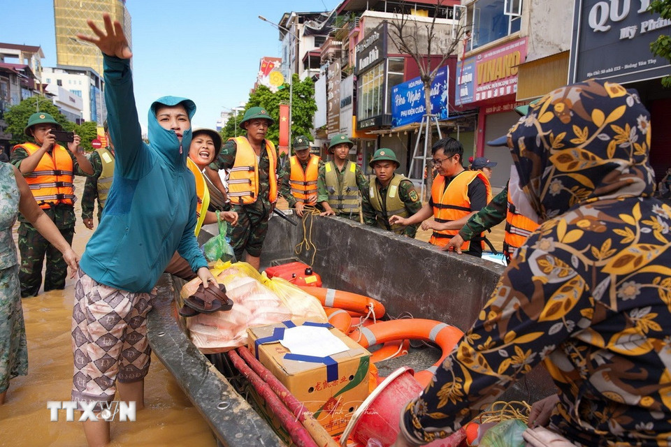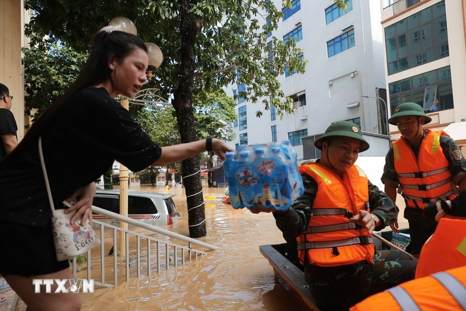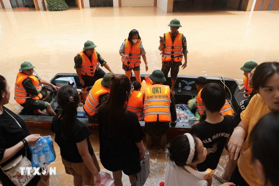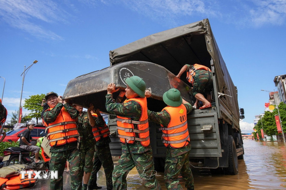 Đoàn cứu hộ Quân khu 1 vận chuyển nước uống đến cho người dân bị cô lập bởi nước lũ ở phường Phan Đình Phùng, tỉnh Thái Nguyên. (Ảnh: Minh Quyết/TTXVN)
