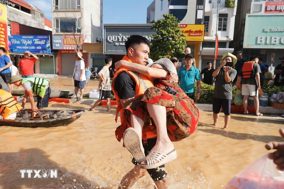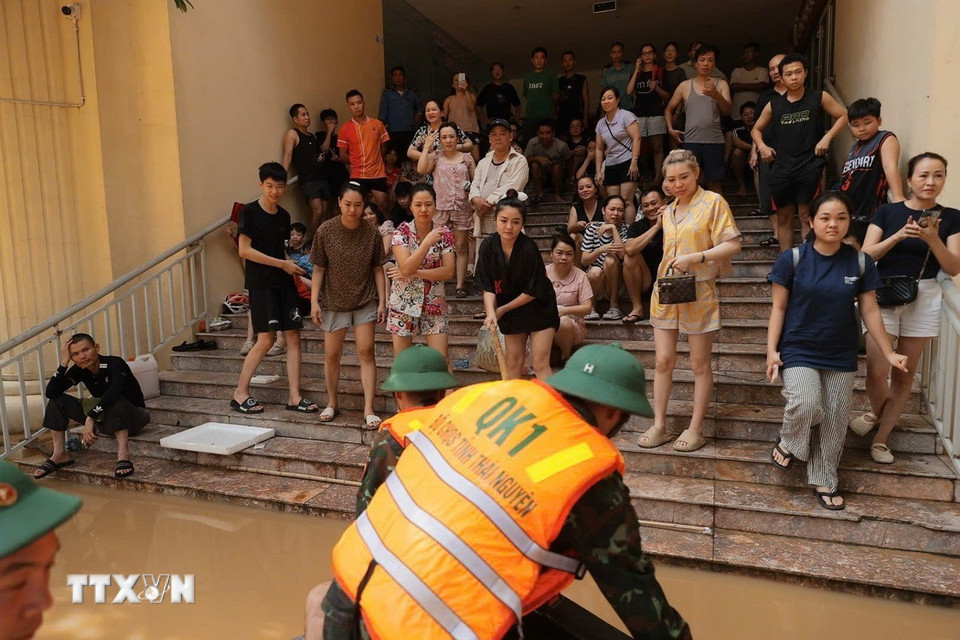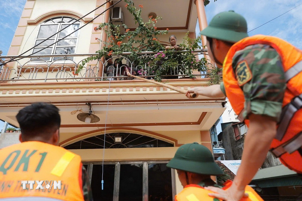Đoàn cứu hộ Quân khu 1 giúp dân di chuyển ra khỏi khu vực bị ngập lụt ở phường Phan Đình Phùng, tỉnh Thái Nguyên. (Ảnh: Minh Quyết/ TTXVN)