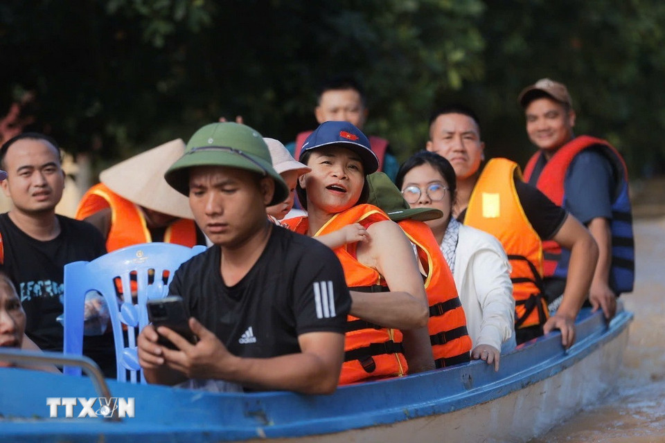 Đoàn cứu hộ Quân khu 1 tiếp cận các khu vực bị cô lập bởi nước ngập sâu tại phường Phan Đình Phùng, tỉnh Thái Nguyên để tiếp tế nước uống, đồ ăn. (Ảnh: Minh Quyết/TTXVN)