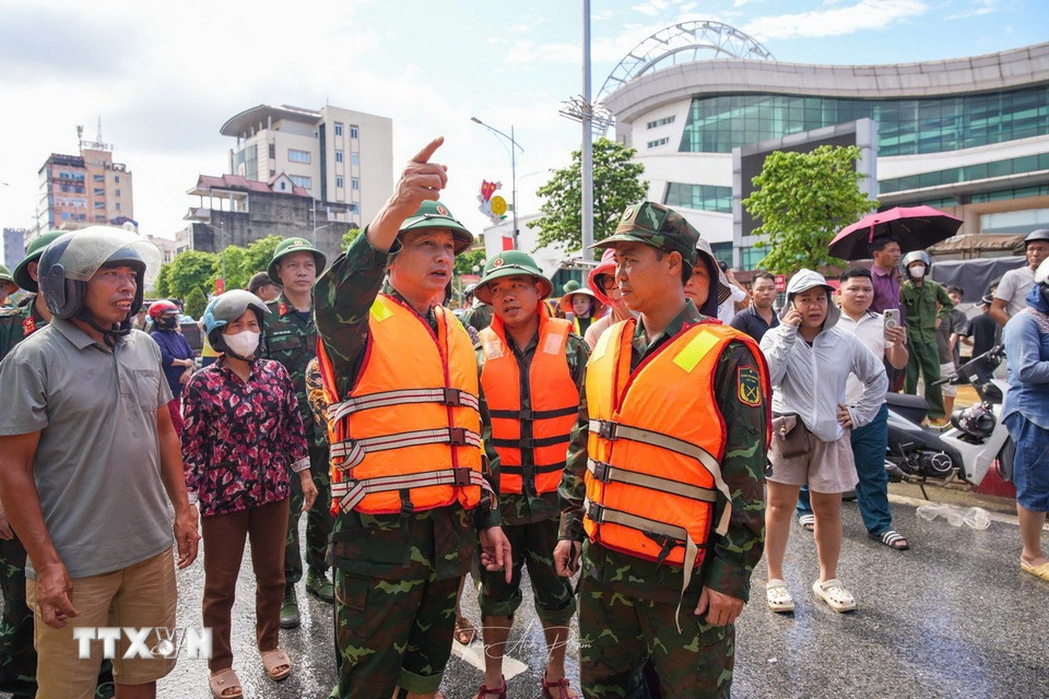 Thiếu tướng Dương Văn Quang, Phó Chính ủy Quân khu 1 chỉ đạo công tác cứu hộ, giúp nhân dân vùng ngập lụt tỉnh Thái Nguyên khắc phục hậu quả. (Ảnh: Phạm Tuấn Anh/TTXVN)