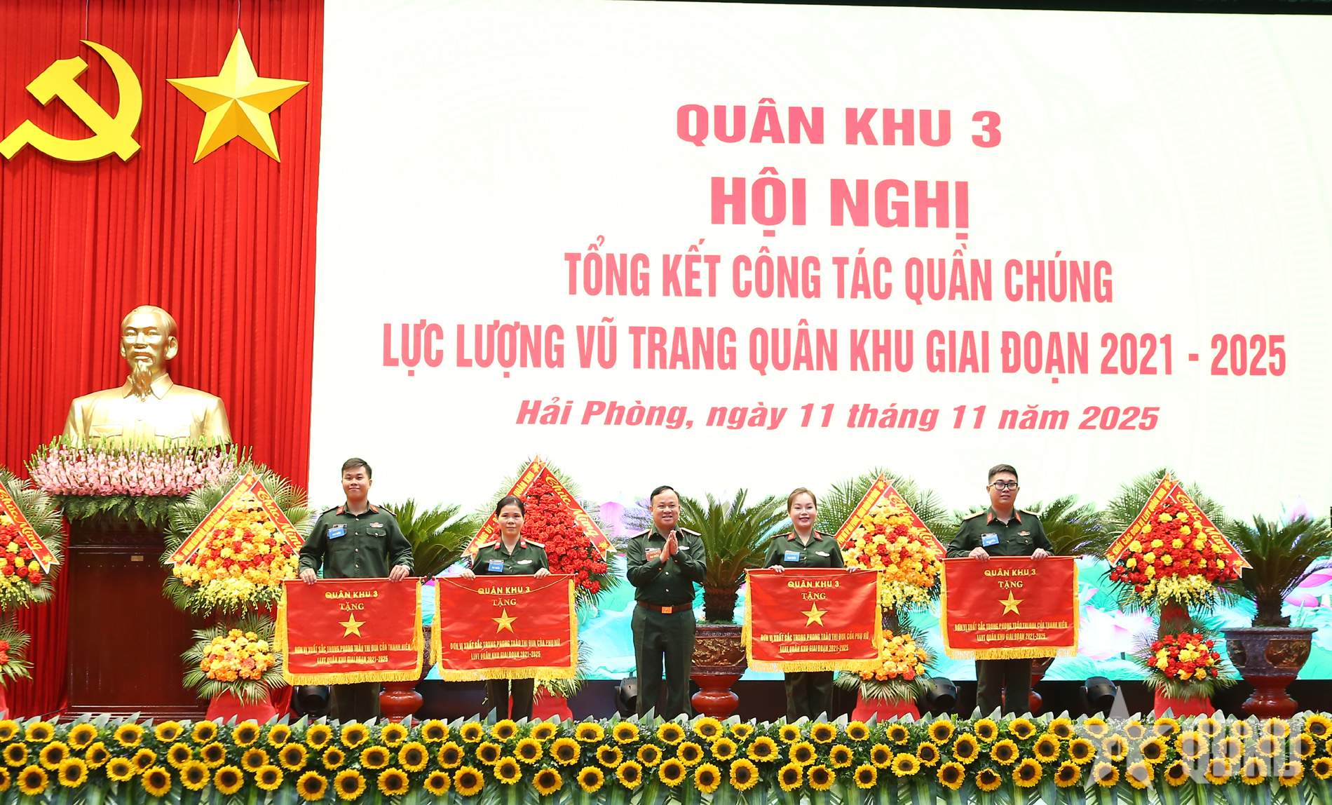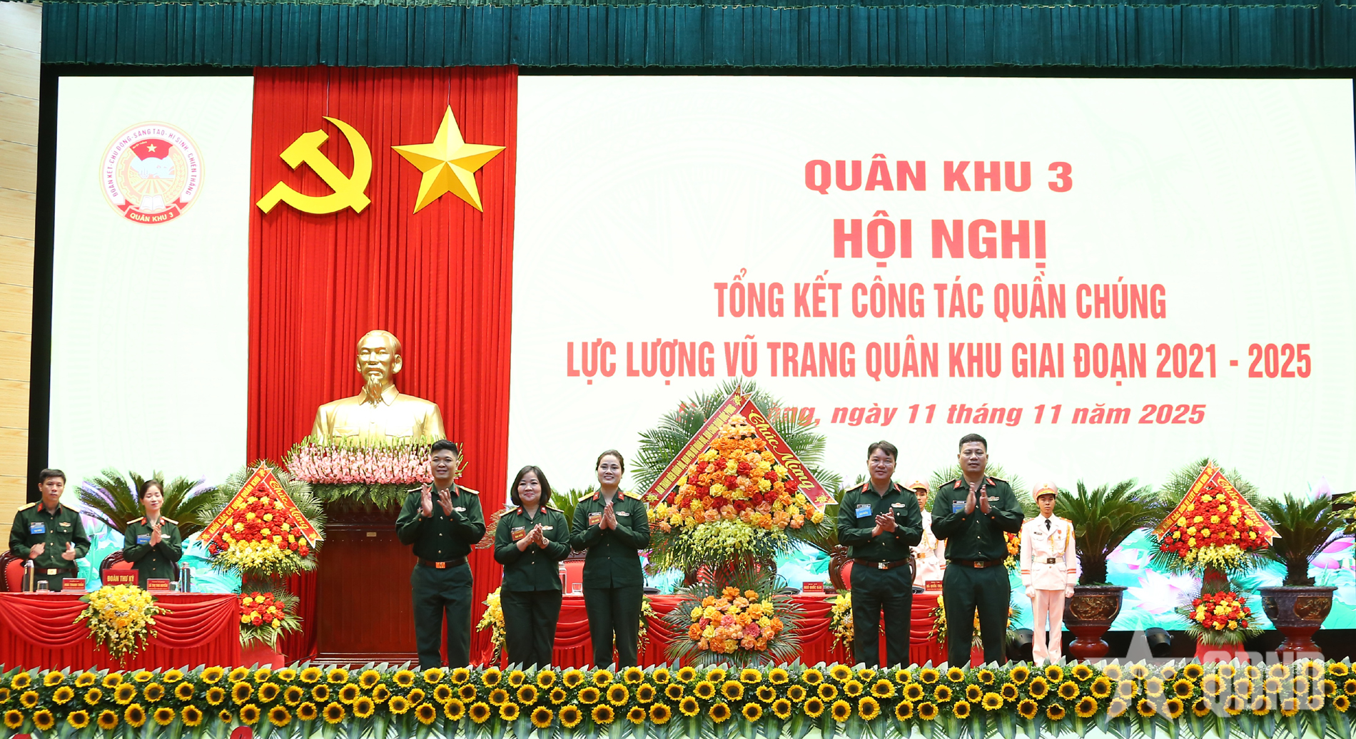 Đại diện Ban Công đoàn, Ban Thanh niên, Ban Phụ nữ Quân đội tặng hoa chúc mừng hội nghị.