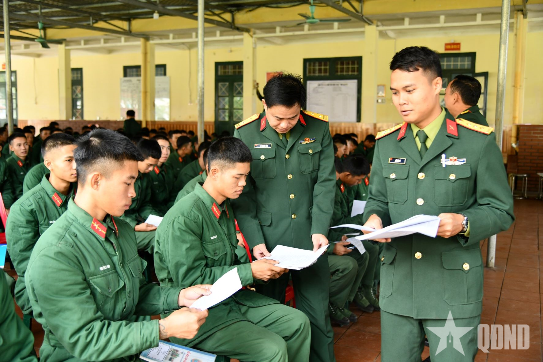 Đoàn công tác Phòng Bảo vệ an ninh, Cục Chính trị Quân khu 4 phát phiếu khảo sát một số nội dung về tình hình tư tưởng, chấp hành kỷ luật của quân nhân chuẩn bị xuất ngũ.