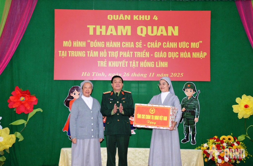Lãnh đạo Bộ tư lệnh Quân khu 4 trao quà tặng trung tâm.