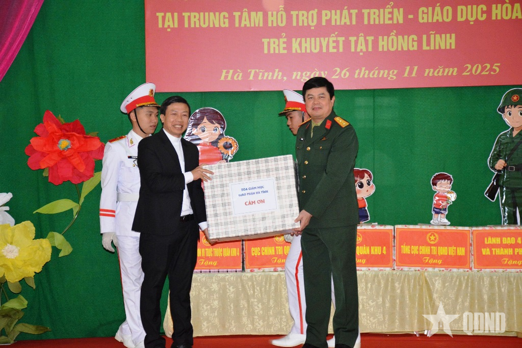 Đại diện Tòa giám mục Giáo phận Hà Tĩnh trao quà tặng Bộ tư lệnh Quân khu 4.