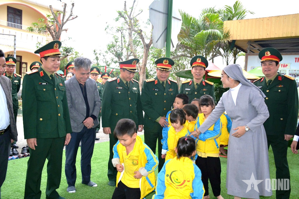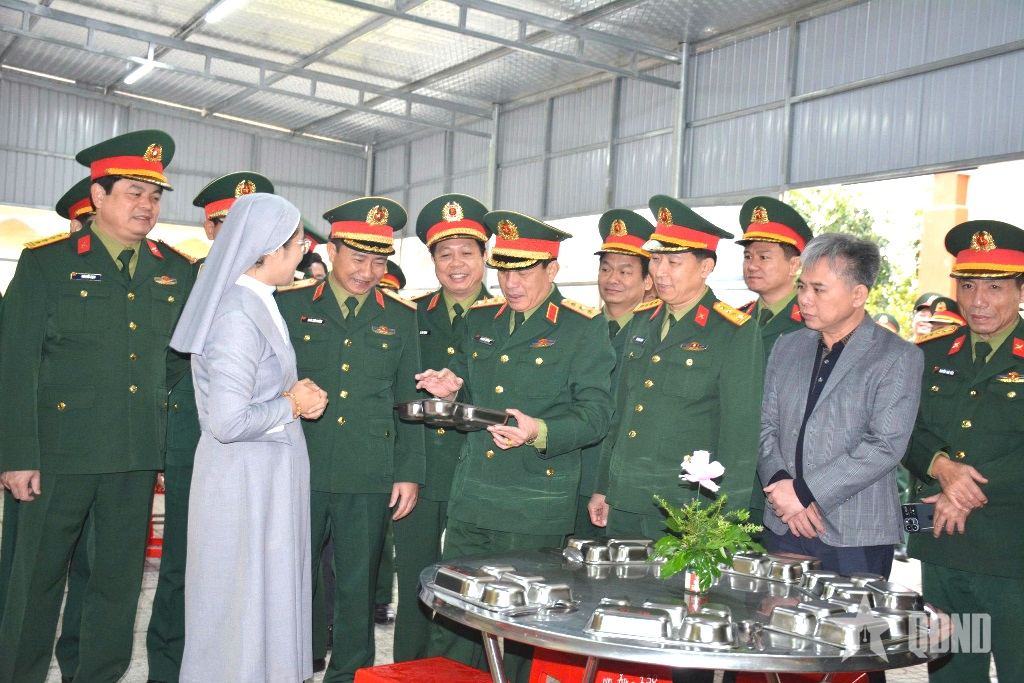 Thượng tướng Trương Thiên Tô và các đại biểu tham quan khu nhà ăn vừa được Bộ CHQS tỉnh Hà Tĩnh xây dựng trao tặng Trung tâm Hỗ trợ phát triển-Giáo dục hòa nhập trẻ khuyết tật Hồng Lĩnh.