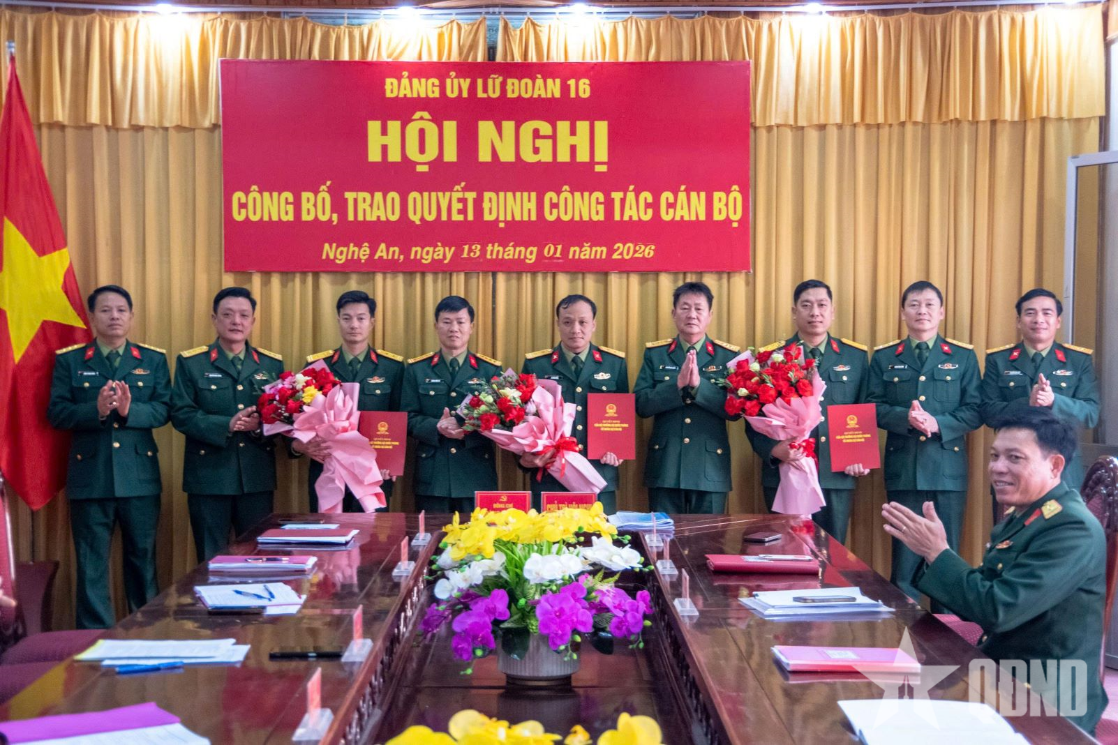 Đảng ủy Lữ đoàn 16 trao quyết định và tặng hoa chúc mừng các đồng chí được điều động, bổ nhiệm.