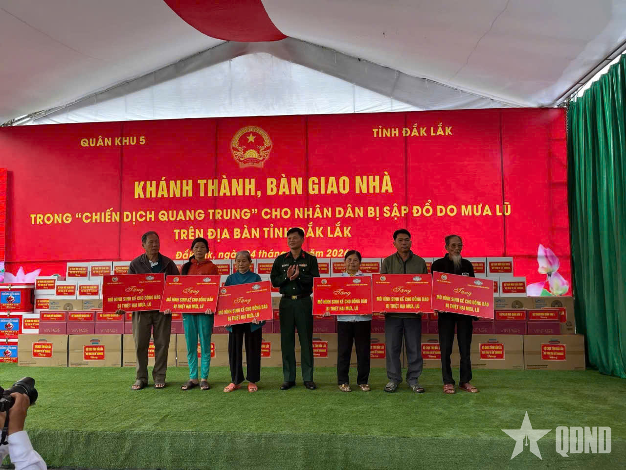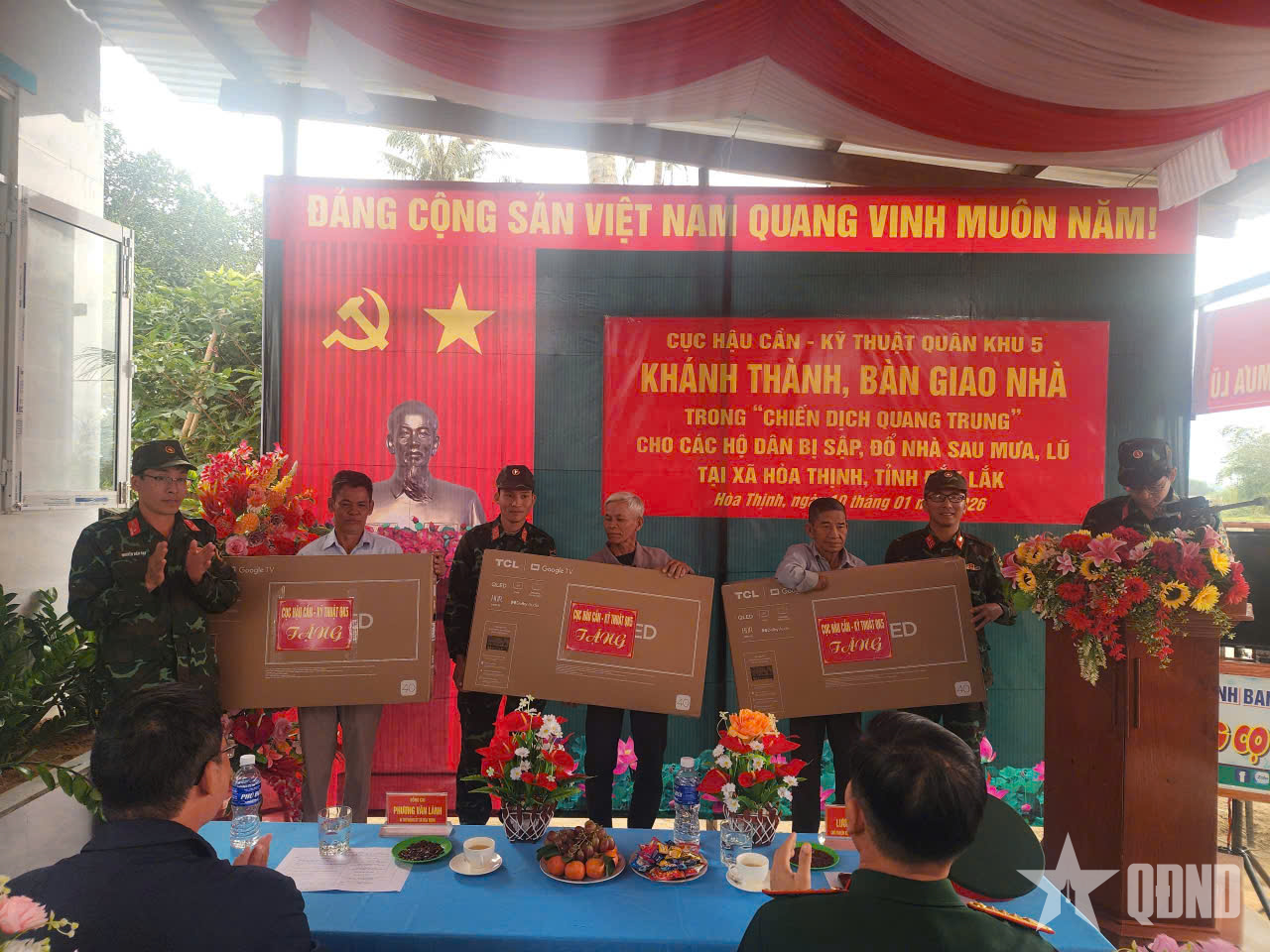 Kết quả, trên địa bàn Quân khu đã tổ chức xây mới 610 nhà, sửa chữa 314 nhà cho nhân dân các tỉnh Đắk Lắk, Gia Lai, Khánh Hòa, Quảng Ngãi và TP Đà Nẵng. Riêng Cục Hậu cần-Kỹ thuật trực tiếp tổ chức xây dựng 4 nhà mới, 2 nhà sửa chữa tại xã Hòa Thịnh, tỉnh Đắk Lắk, với tổng 1.900 ngày công, bảo đảm chất lượng, tiến độ và an toàn tuyệt đối. Tại buổi khánh thành, bàn giao nhà, Quân khu 5 và Cục Hậu cần-Kỹ thuật đã trao tặng người dân vùng lũ 500 nồi cơm điện, 228 chiếc giường gỗ, 10 con trâu giống, 6 ti vi cùng nhiều vật dụng sinh hoạt góp phần giúp các hộ gia đình sớm ổn định cuộc sống trong những ngôi nhà mới.