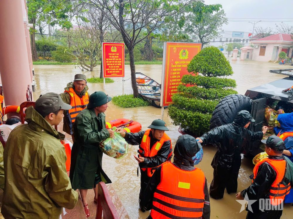 Lực lượng vũ trang Quân khu 5 tiếp tế nhu yếu phẩm đến người dân vùng lũ.