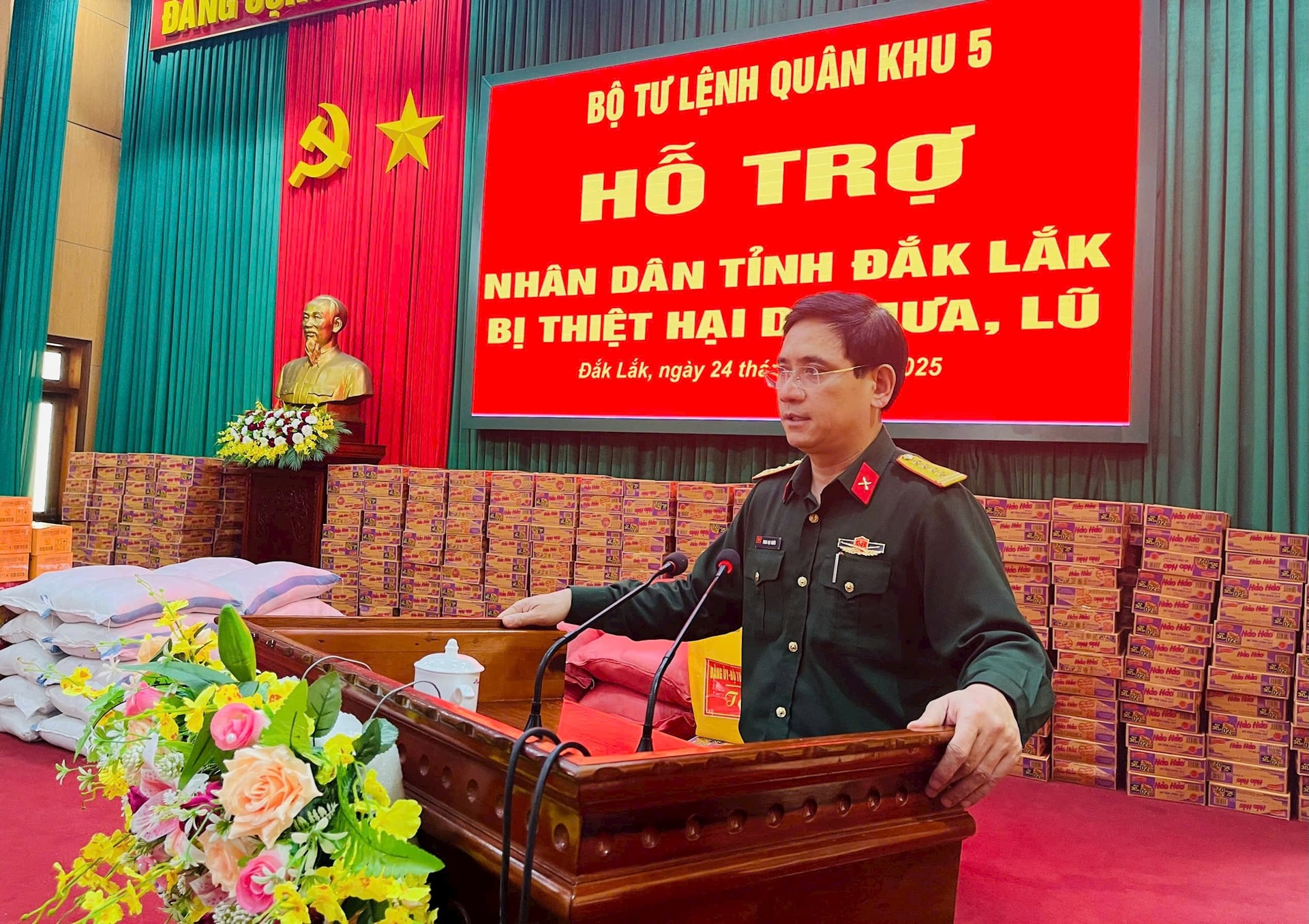 Đại tá Phan Đại Nghĩa – Phó Tư lệnh, Tham mưu trưởng Quân khu 5 phát biểu tại buổi trao hỗ trợ Nhân dân tỉnh Đắk Lắk bị thiệt hại do mưa lũ.