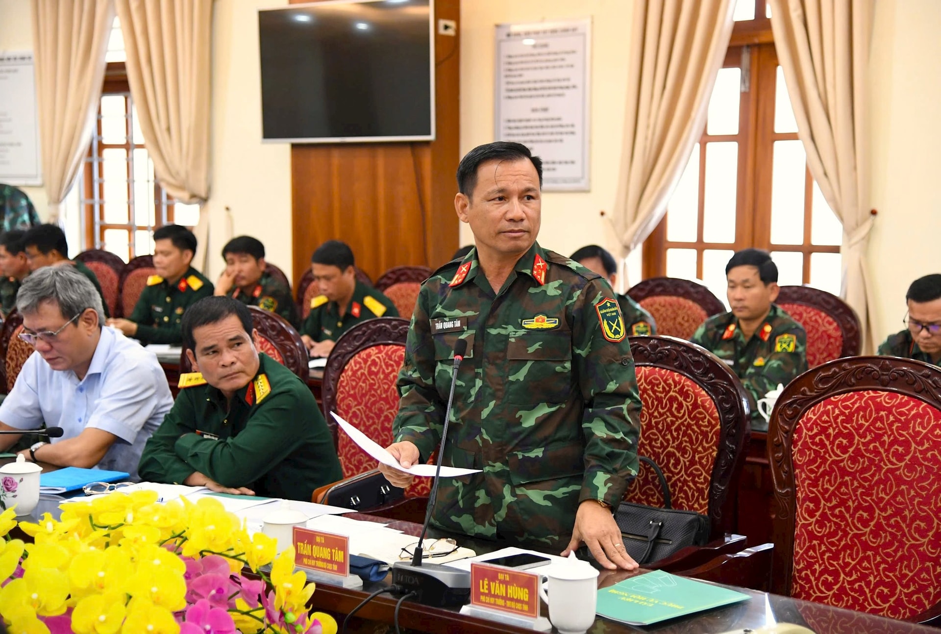 Đại diện Bộ CHQS tỉnh báo cáo tình hình và đề xuất triển khai lực lượng, phương án xây dựng nhà cho nhân dân.