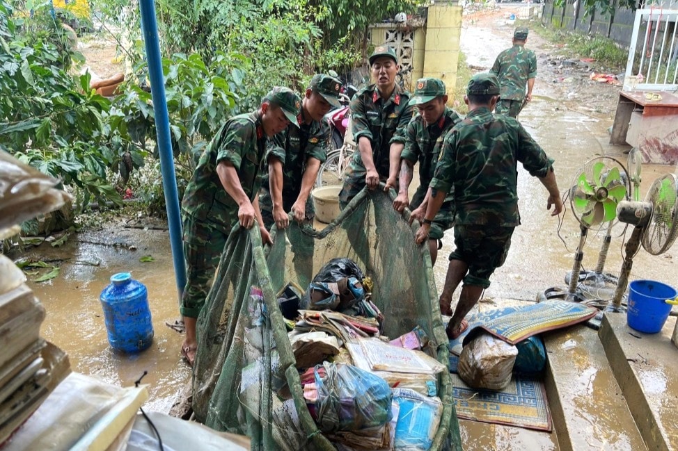 Lực lượng quân đội giúp dân dọn dẹp nhà cửa sau lũ.