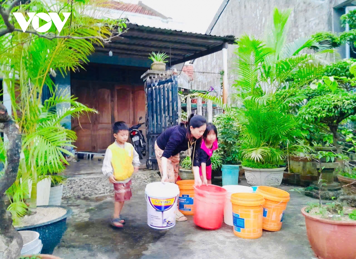 Nhiều người dân mang xô ra khu vực tập kết nước sạch để lấy nước.