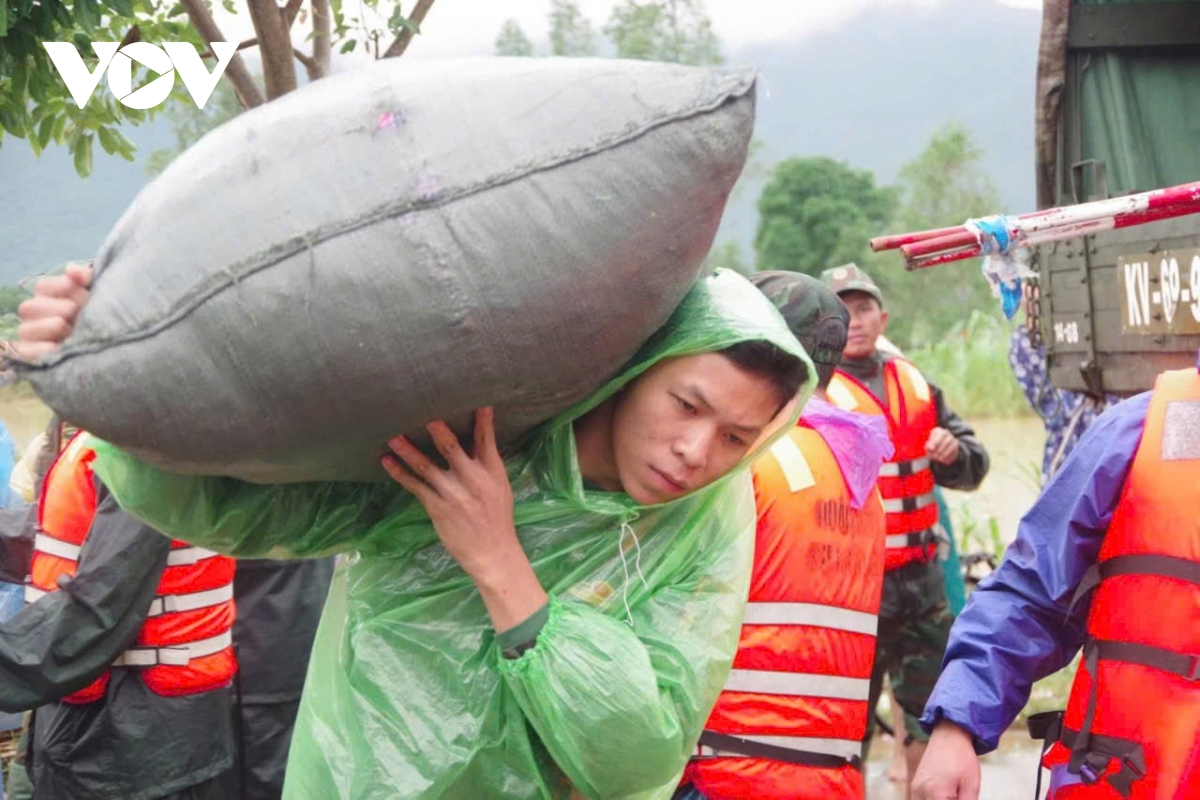 Bộ đội Sư đoàn 2, Quân khu 5 vận chuyển hàng hóa hỗ trợ bà con xã Hòa Xuân, tỉnh Đắk Lắk.