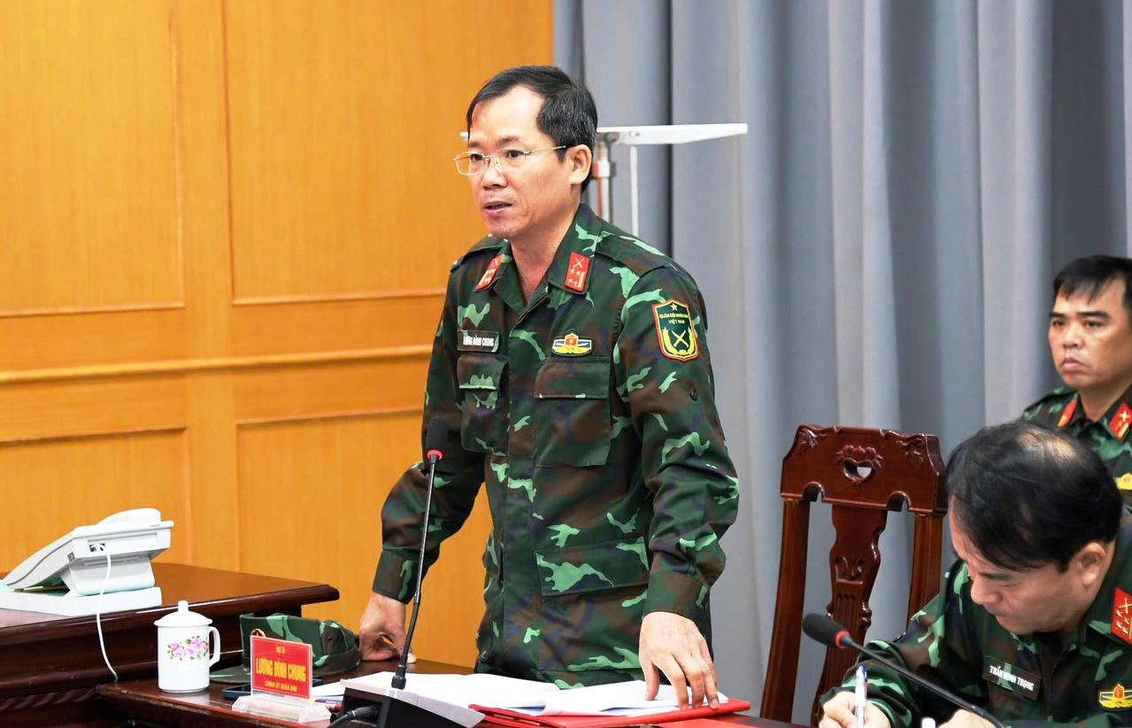 Đại tá Lương Đình Chung - Chính ủy Quân khu 5 phát biểu tại hội nghị.