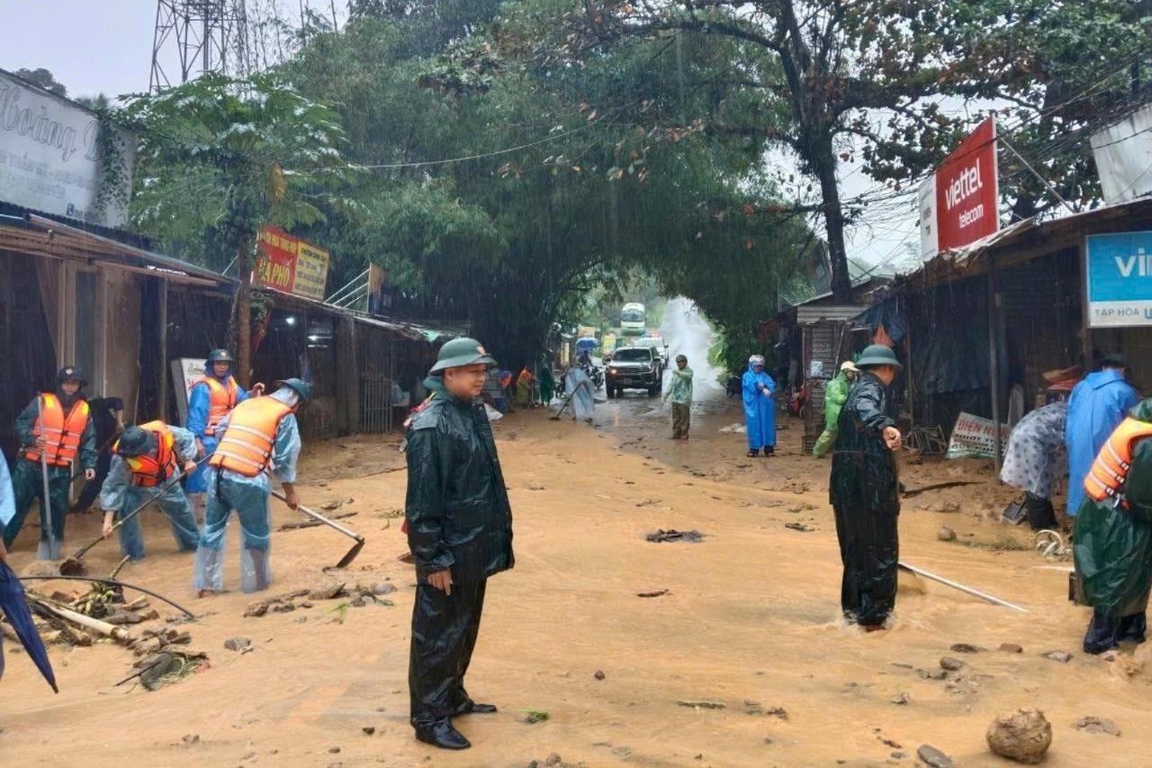 Lực lượng Quân khu 5 phối hợp cùng dân quân, Công an địa phương khẩn trương dọn dẹp, khắc phục hậu quả mưa lũ tại khu dân cư.