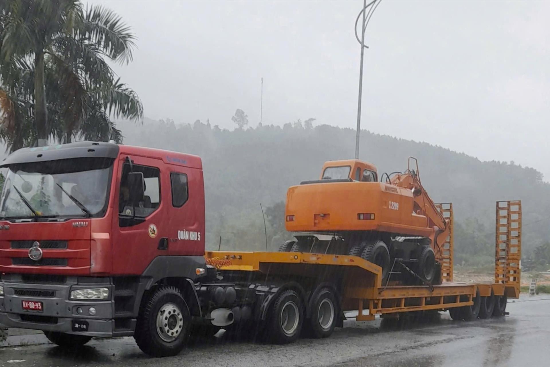 Xe chuyên dụng của Quân khu 5 cơ động phương tiện, trang thiết bị đến khu vực xung yếu phục vụ công tác ứng cứu, khắc phục sạt lở.