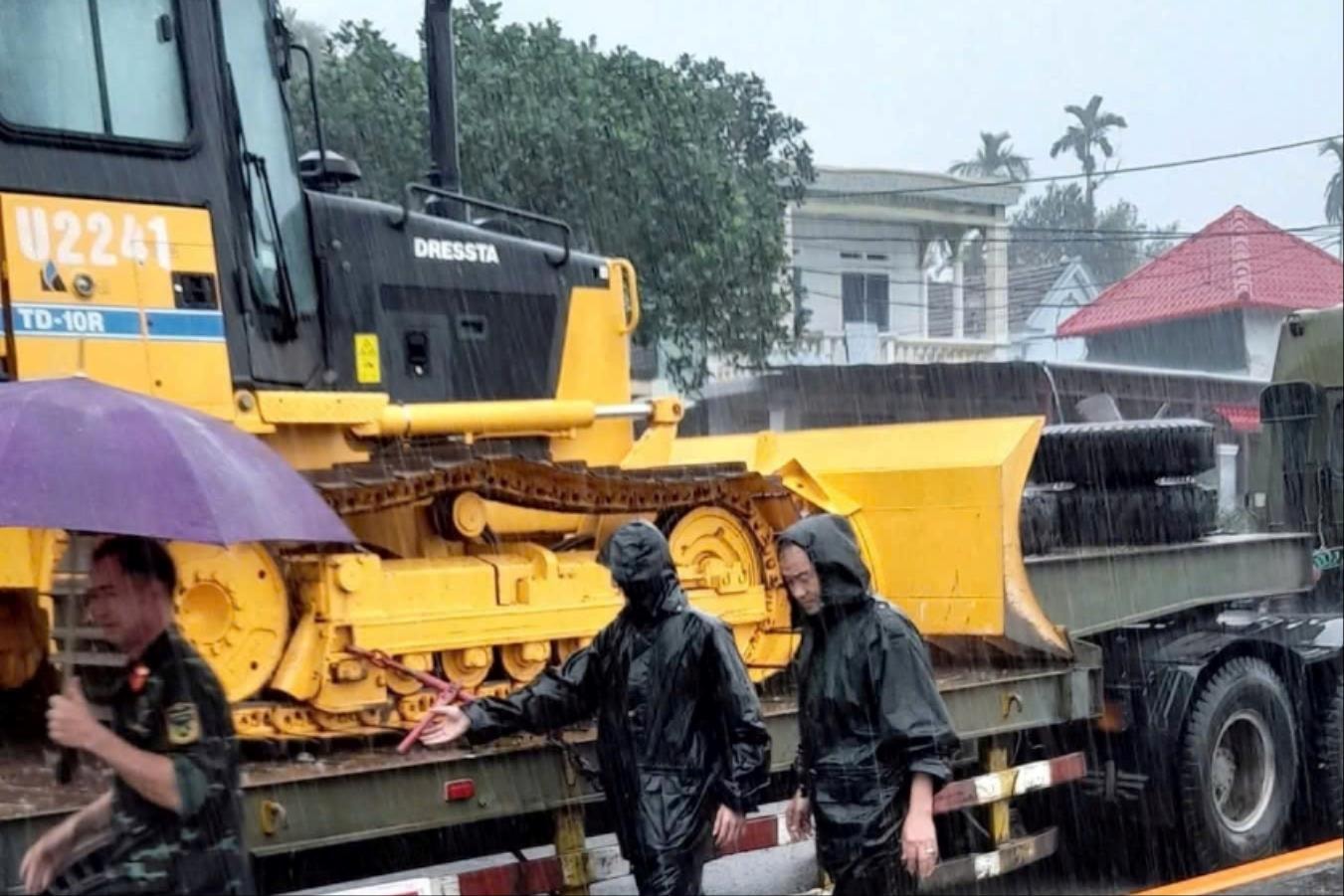 Quân khu 5 đưa xe ủi đến hiện trường, sẵn sàng mở đường và xử lý điểm sạt lở trong điều kiện thời tiết mưa to gió lớn.
