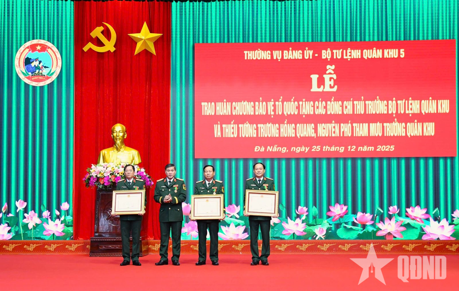 Thừa ủy quyền của Chủ tịch nước, Trung tướng Lê Ngọc Hải, Tư lệnh Quân khu 5 trao Huân chương Bảo vệ Tổ quốc tặng các đồng chí Thủ trưởng Bộ tư lệnh Quân khu và Thiếu tướng Trương Hồng Quang, nguyên Phó tham mưu trưởng Quân khu 5.