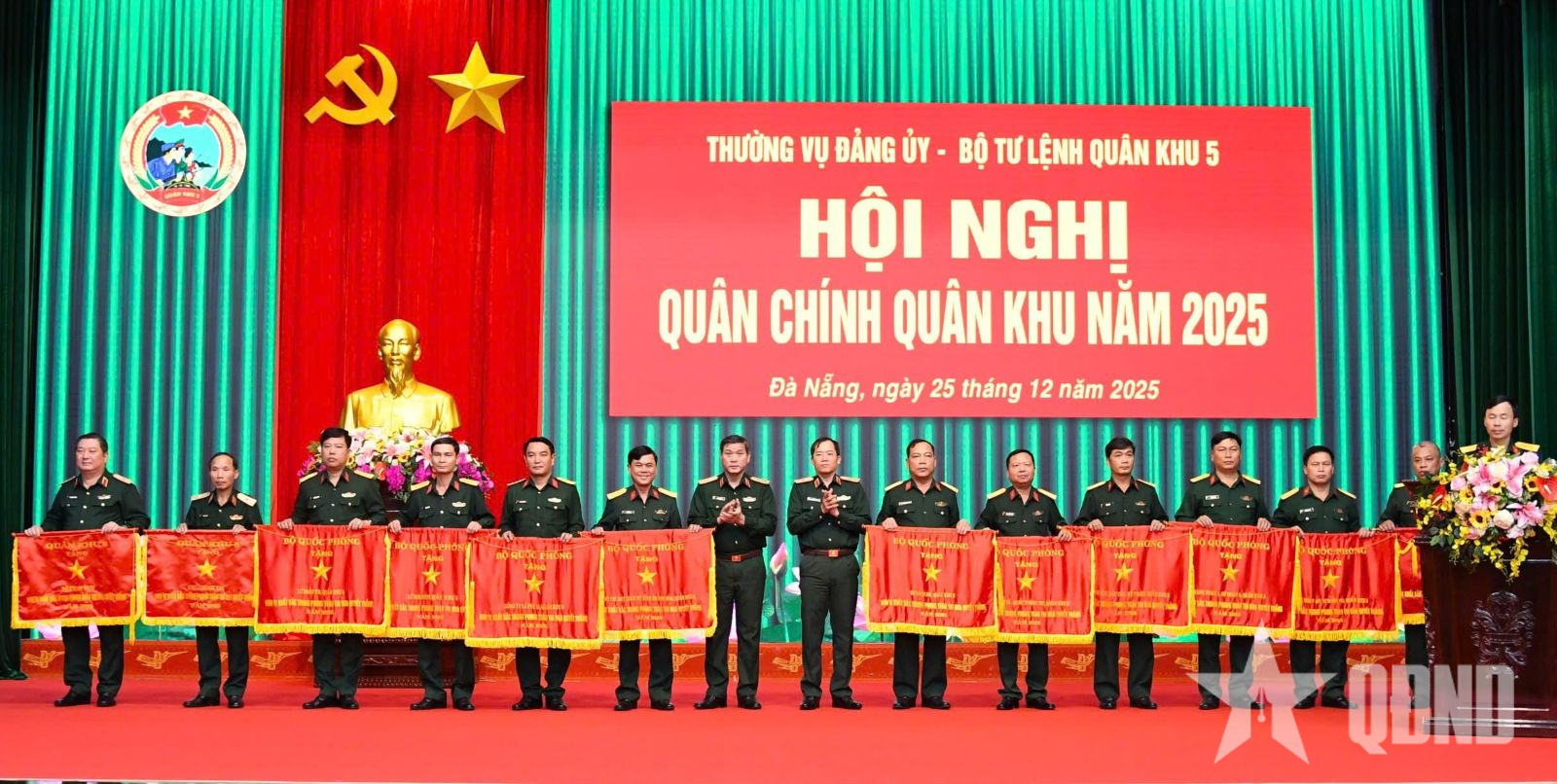 Tư lệnh và Chính ủy Quân khu 5 trao cờ thi đua tặng các đơn vị có thành tích xuất sắc.