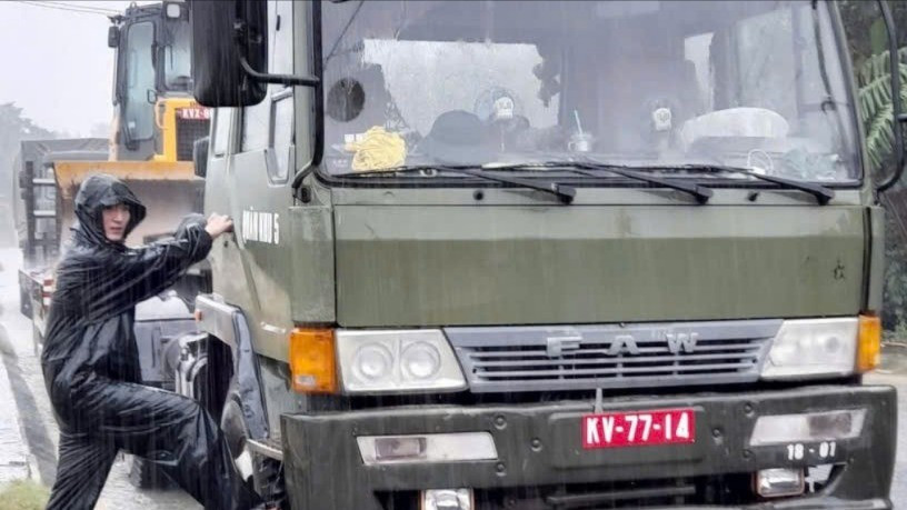 Ban chỉ huy huy động 19 xe các loại gồm xe chỉ huy, xe Kamaz, xe thông tin, đầu kéo, máy múc, máy ủi, xe ca và xe bếp để khắc phục sạt lở đất.