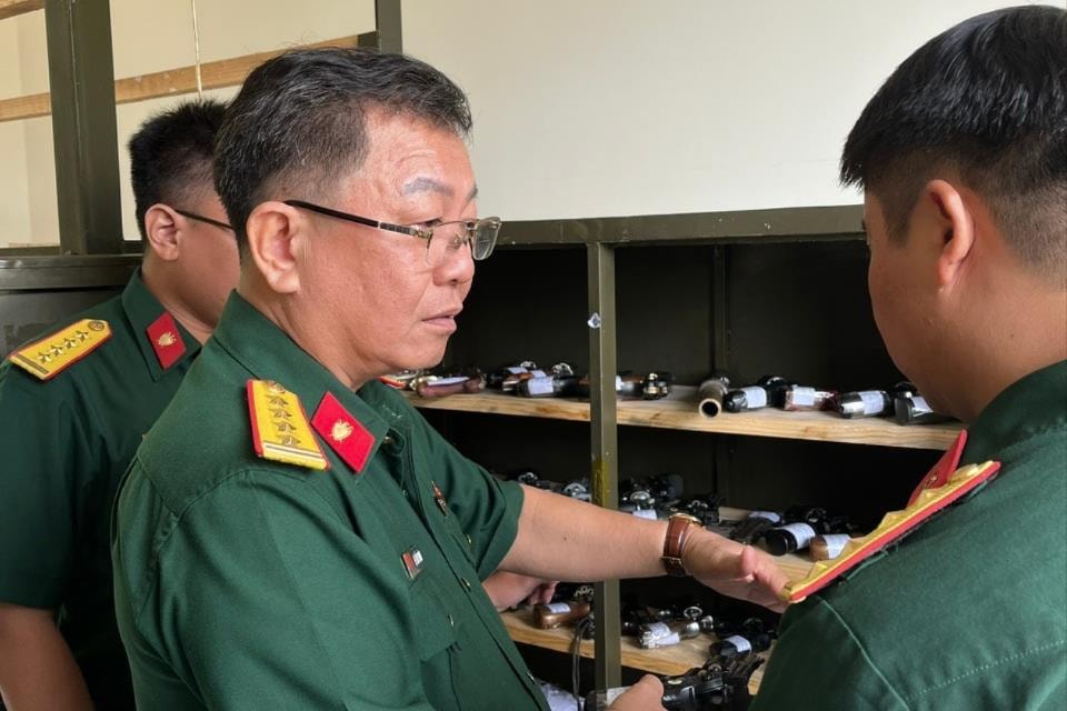 Đại tá Lê Tấn Thành, Trưởng phòng điều tra hình sự Quân khu 7 kiểm tra việc bảo quản súng tại kho vật chứng