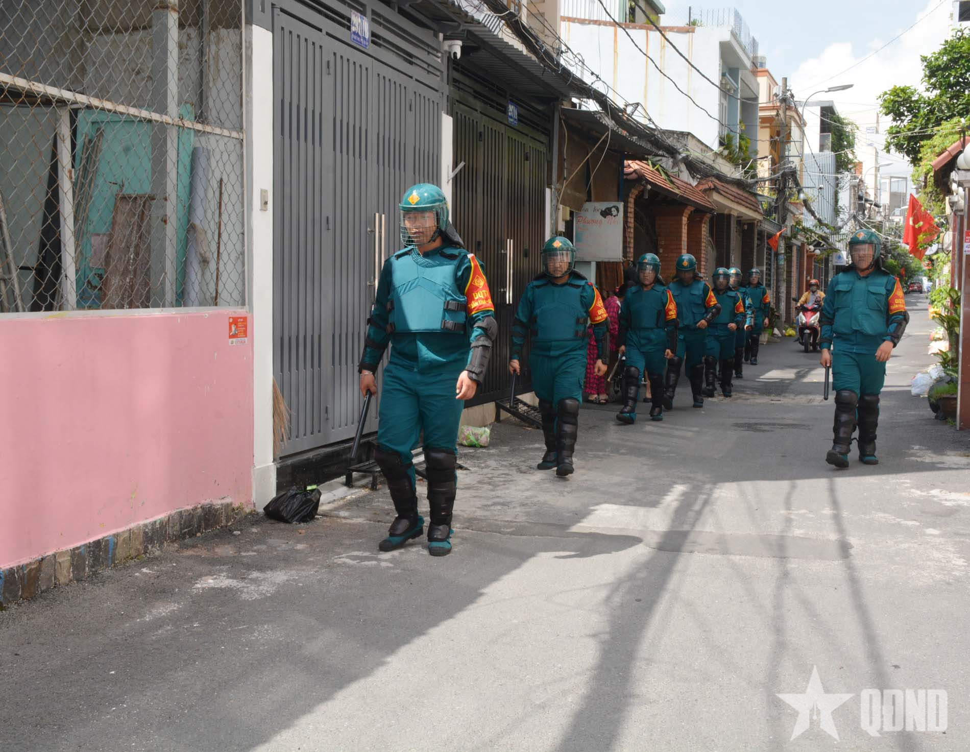 Cán bộ, chiến sĩ dân quân TP Hồ Chí Minh tuần tra địa bàn khu đông dân cư.