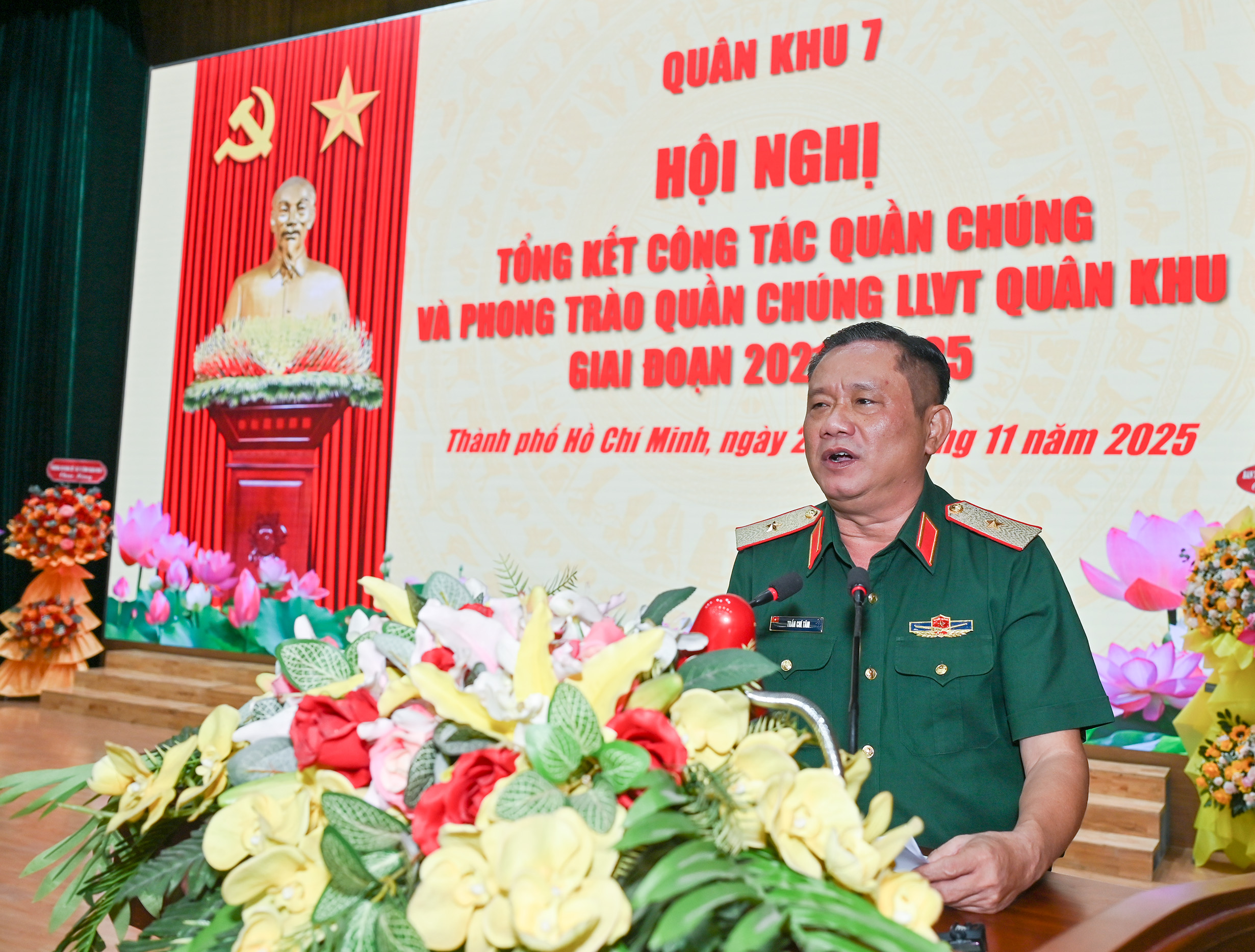 Thiếu tướng Trần Chí Tâm, Phó Chính ủy Quân khu 7, biểu dương những kết quả đạt được của công tác quần chúng và phong trào quần chúng của Quân khu 7 thời gian qua.