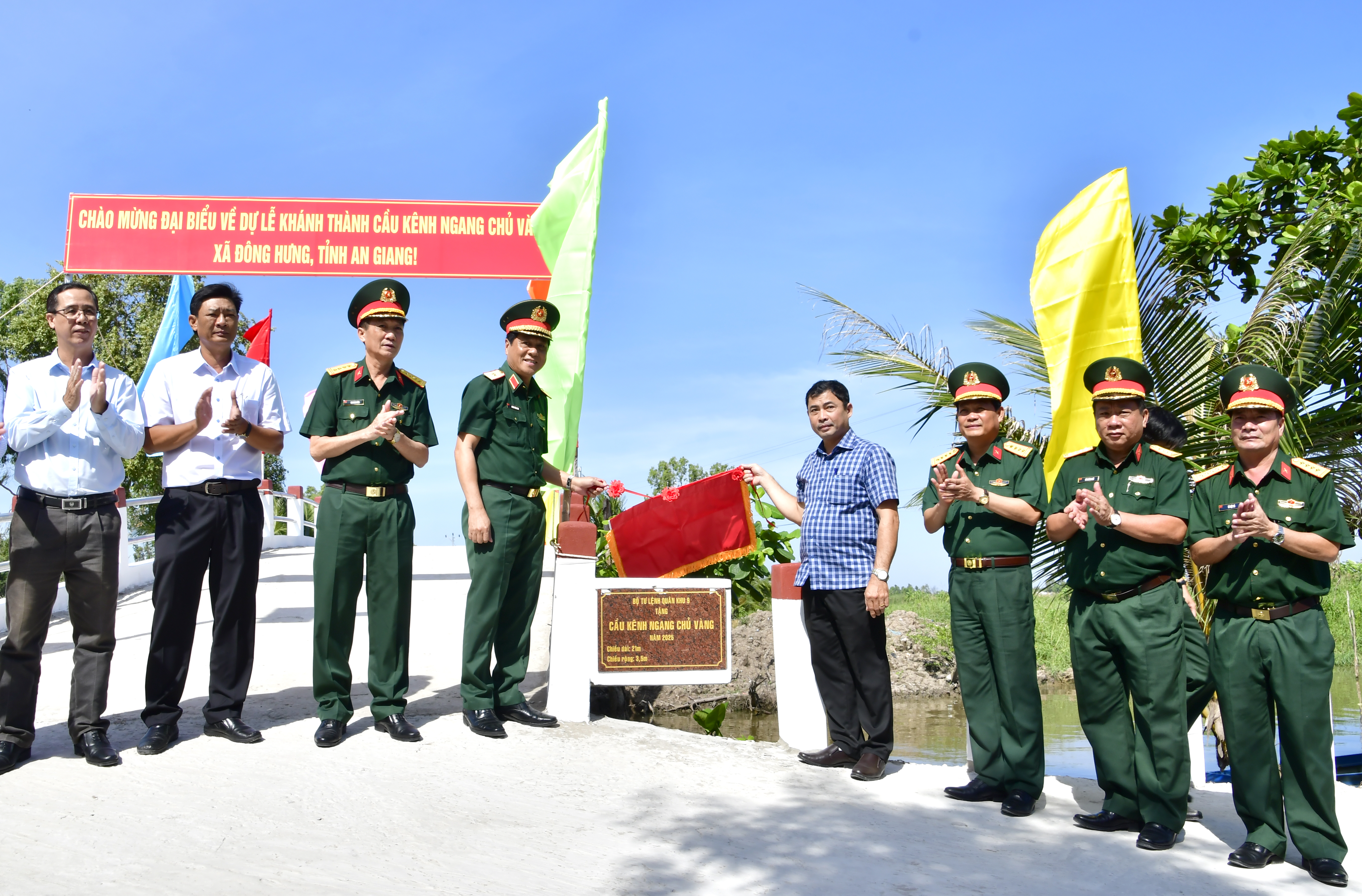 Lãnh đạo Quân khu 9 và đại diện chính quyền địa phương khánh thành cầu Kênh ngang Chủ Vàng (xã Đông Hưng)