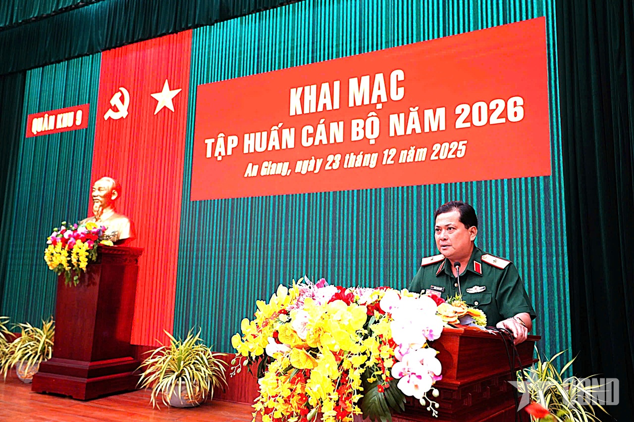 Thiếu tướng Chiêm Thống Nhất, Phó tư lệnh, Tham mưu trưởng Quân khu 9 phát biểu khai mạc tập huấn cán bộ năm 2026.
