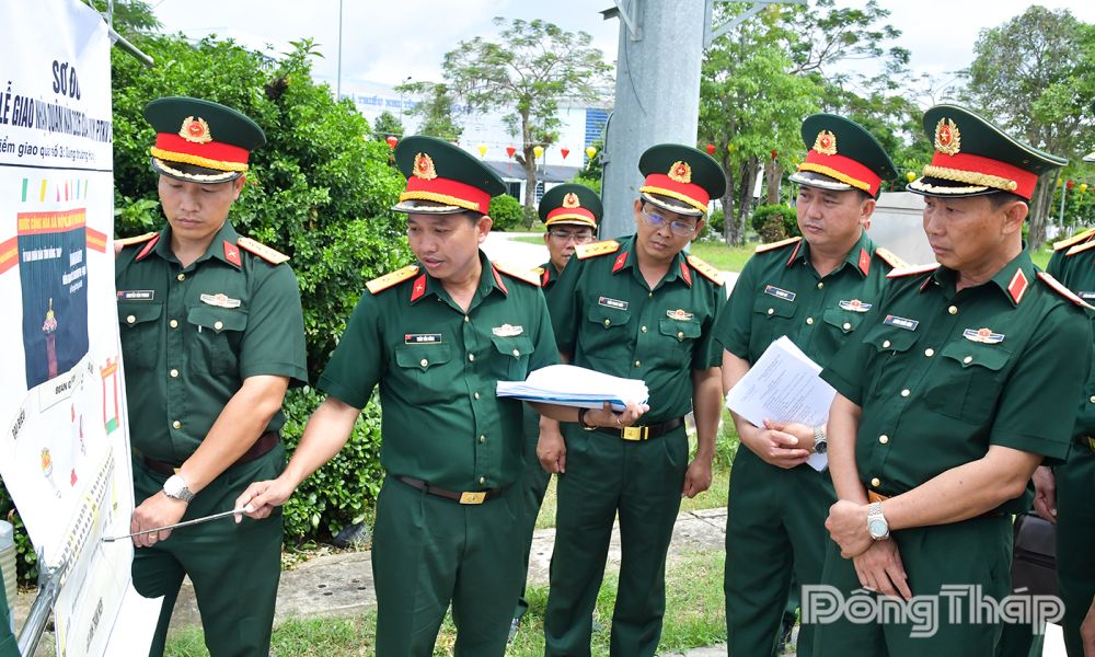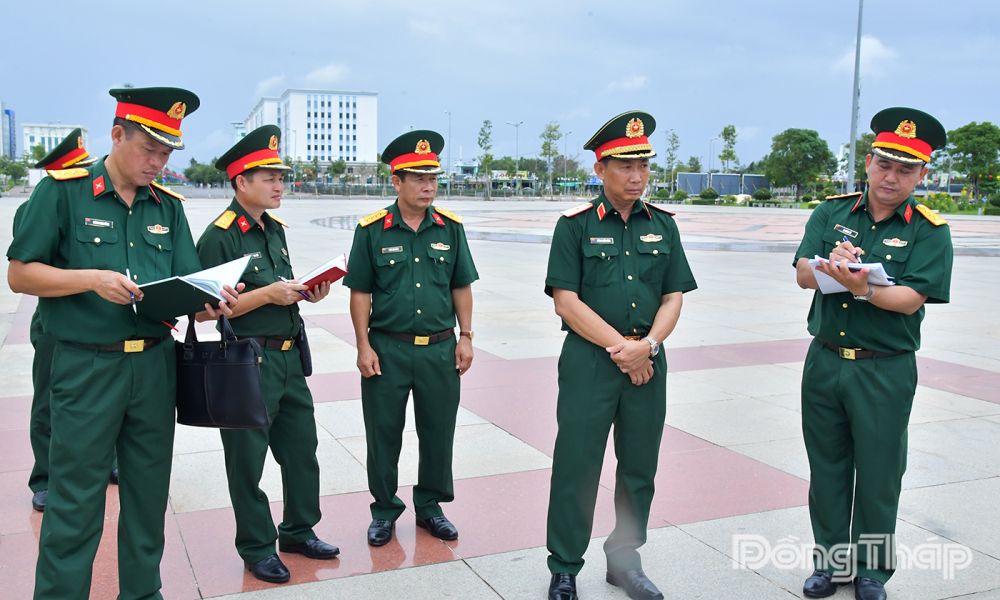 Thiếu tướng Huỳnh Chiến Công, Phó Tham mưu trưởng Quân khu 9 (bìa phải) kiểm tra sơ đồ bố trí khu vực Lễ giao nhận quân tại Quảng trường Hùng Vương.