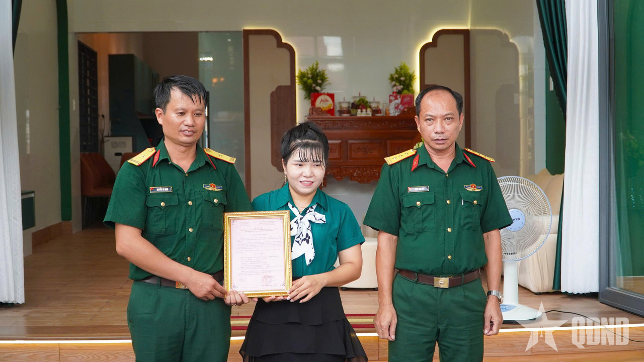 Thượng tá Trần Văn Huy, Phó chính ủy Lữ đoàn Pháo binh 6 (Quân khu 9) trao quyết định bàn giao "Nhà đồng đội" tặng gia đình Thiếu tá Nguyễn Bá Định.