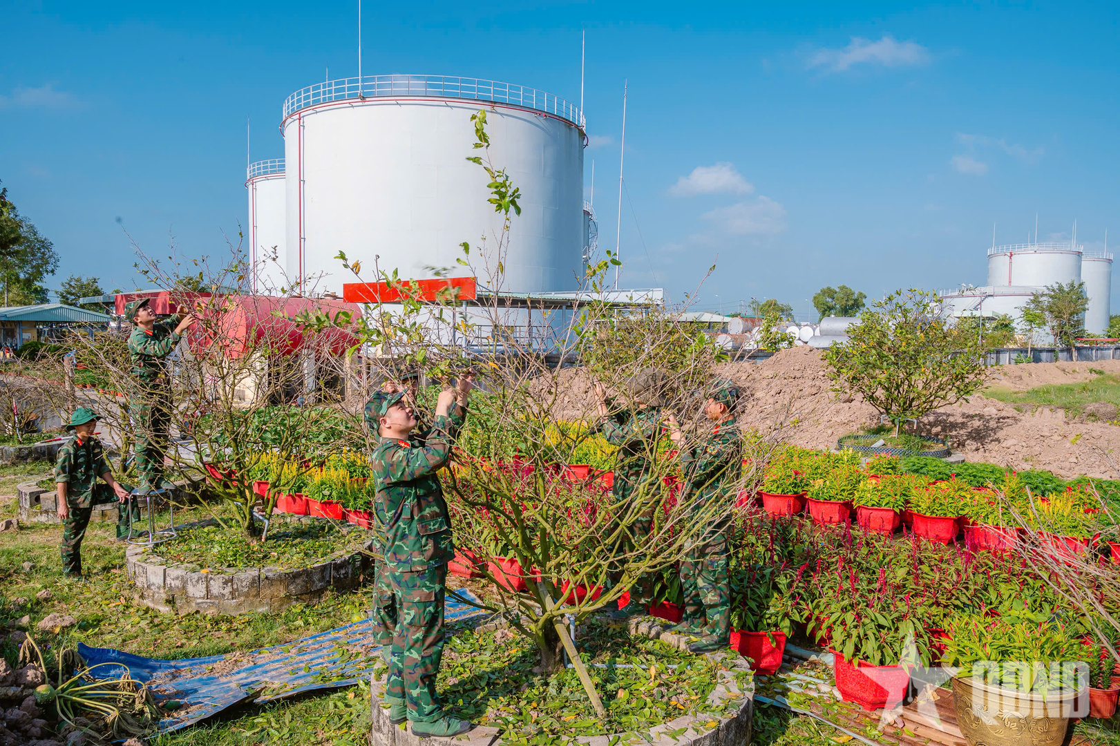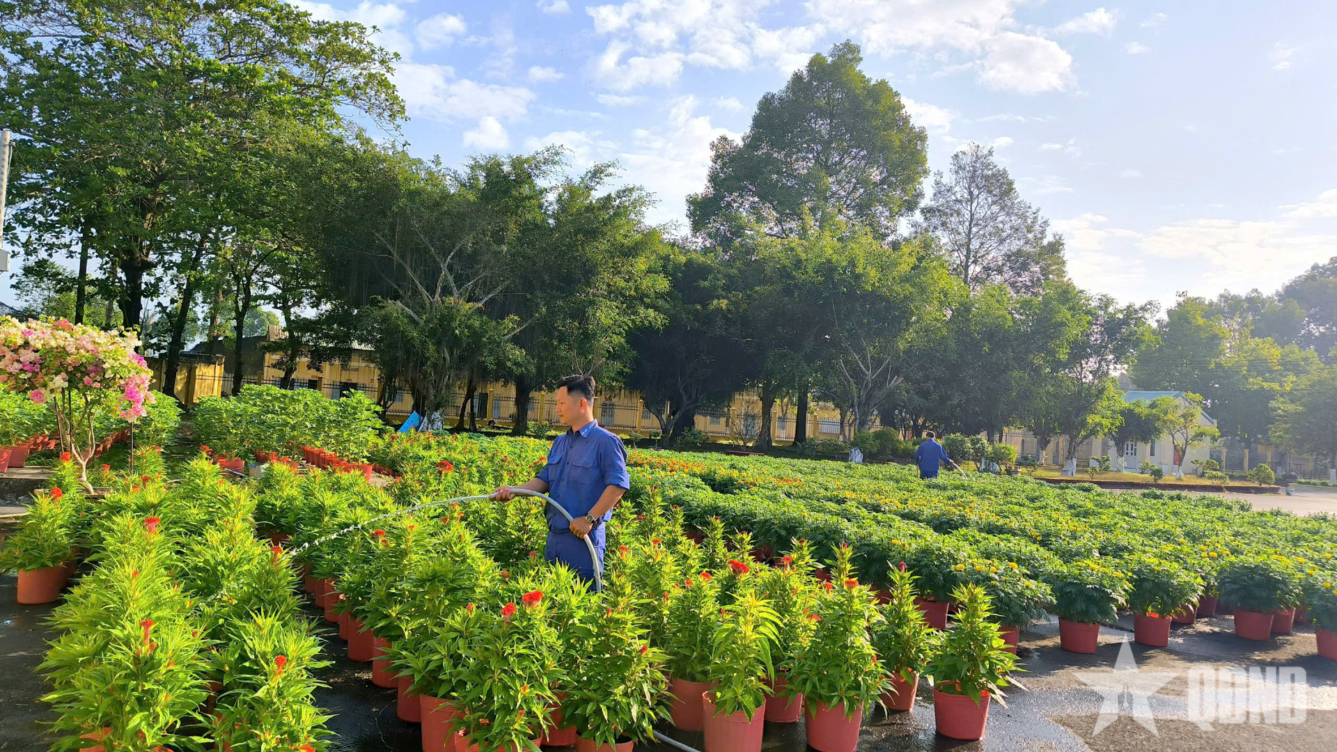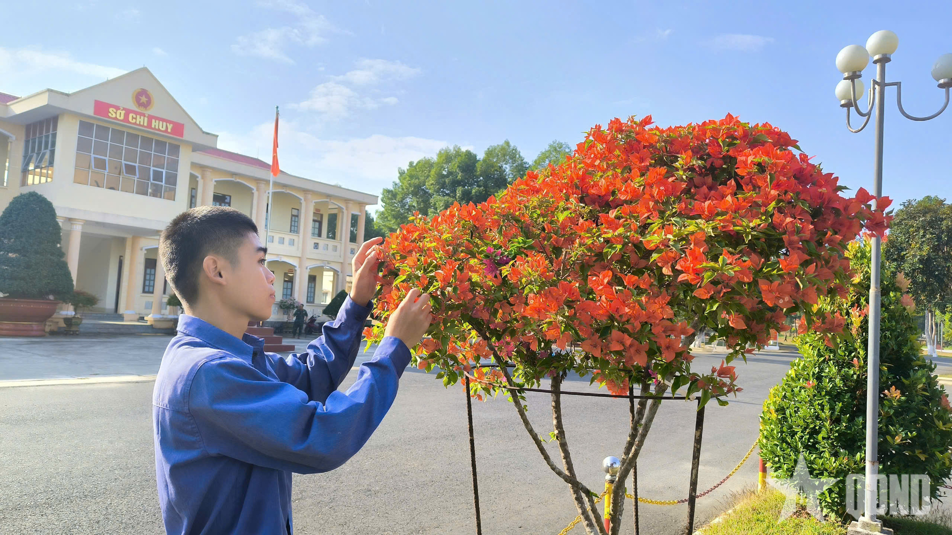 Trên từng khoảng sân, dọc lối đi, khu nhà làm việc, cán bộ, chiến sĩ miệt mài chăm chút từng chậu mai, khóm cúc, tỉ mỉ cắt tỉa từng nhánh lá, vun lại từng gốc cây.