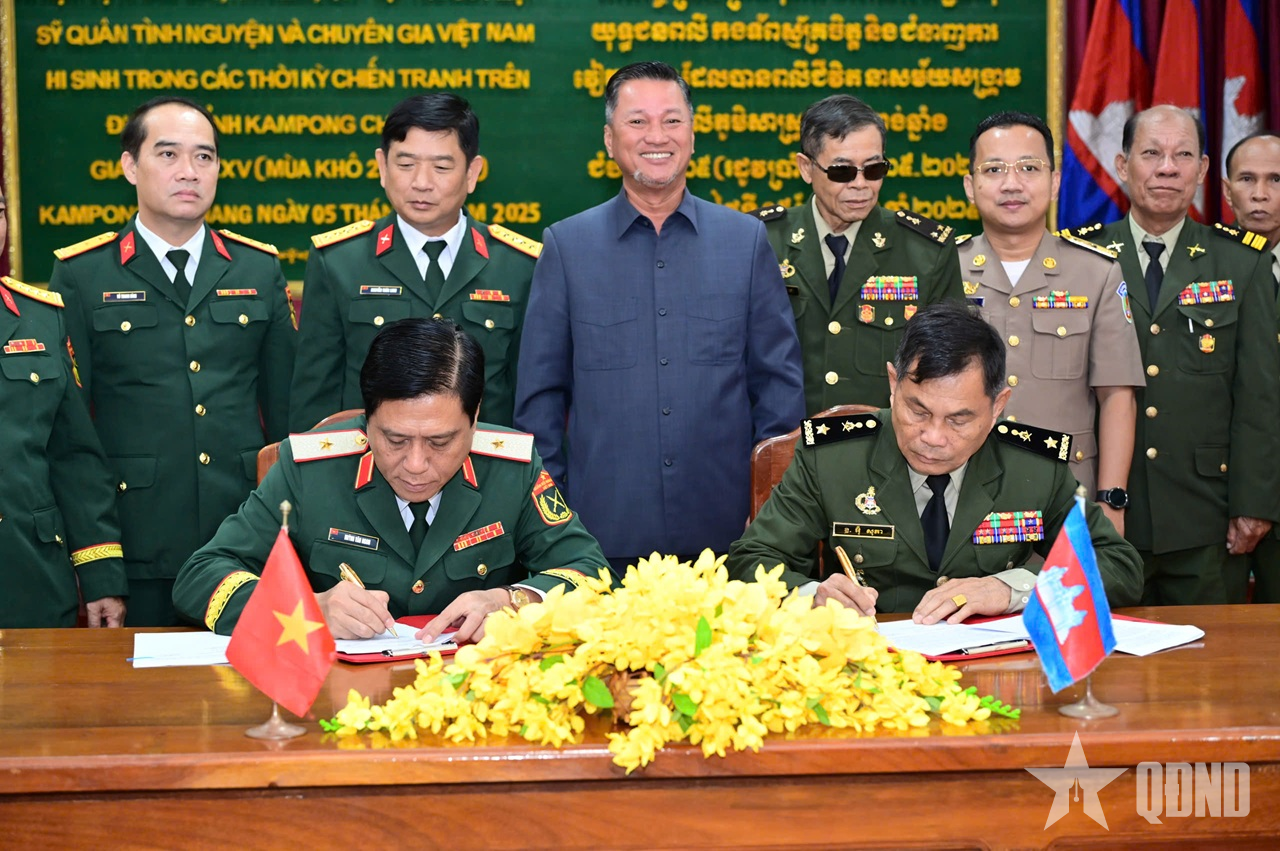 Thiếu tướng Huỳnh Văn Ngon ký kết biên bản tìm kiếm hài cốt liệt sĩ với Ban Chuyên trách tỉnh Kampong Chhnang, Campuchia.