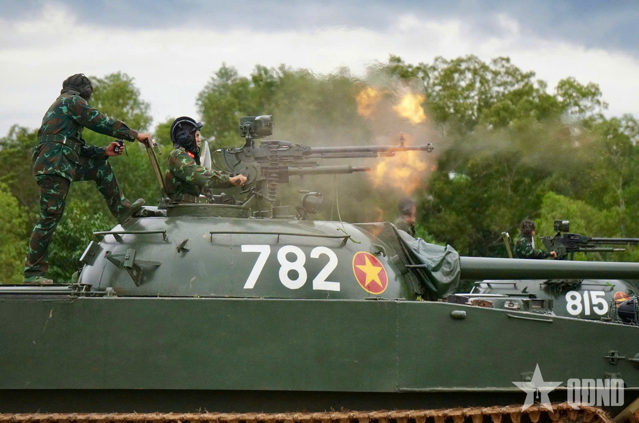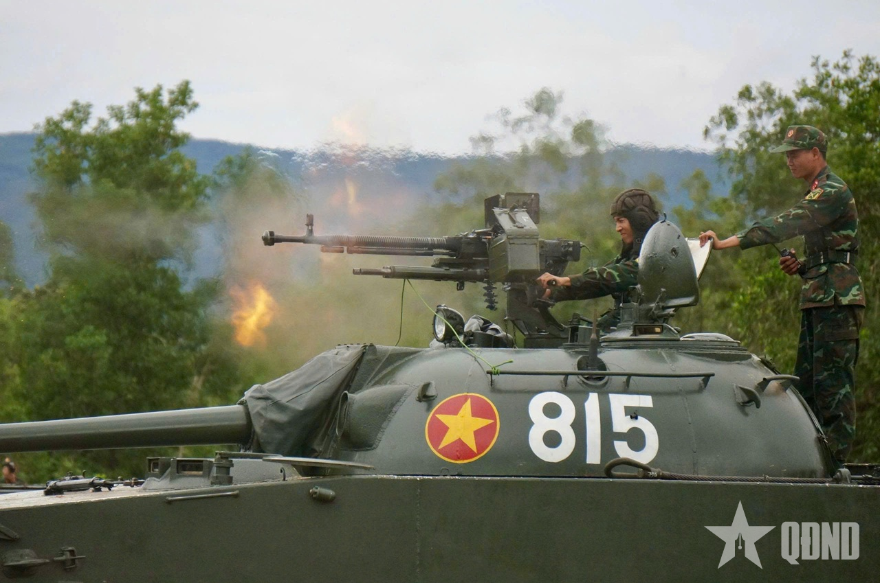 Các kíp xe thực hành bắn bài 1a, bài 2 súng máy 12,7mm trên xe tăng.