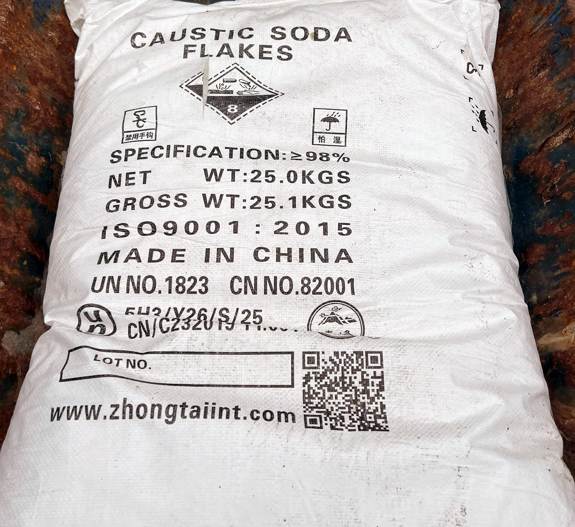Hóa chất xút dùng trong sản xuất xà phòng được công ty TNHH sản xuất và thương mại Dũng Phát sử dụng trong quá trình sơ chế lòng lợn muối. Ảnh: Hoài Nam
