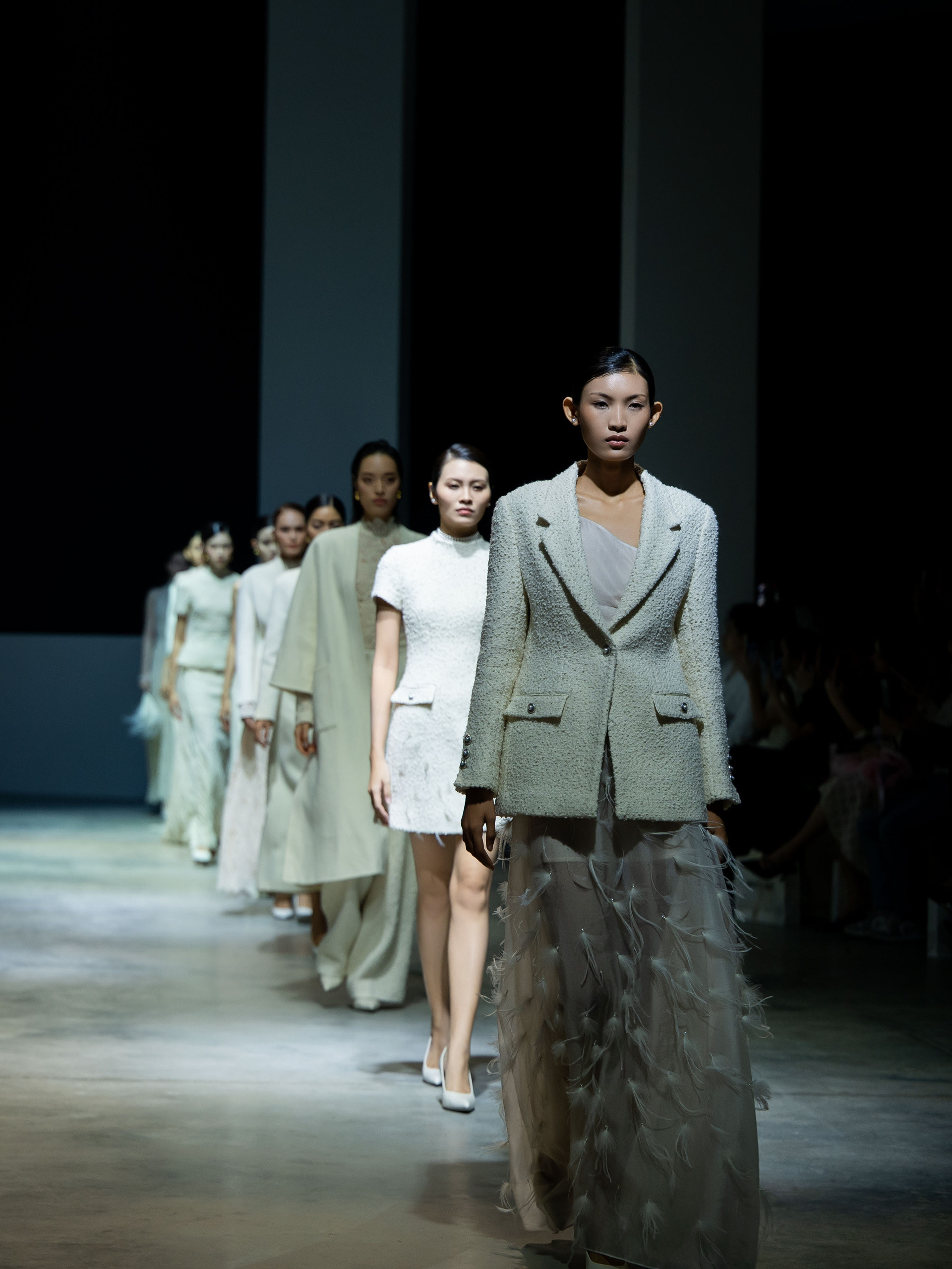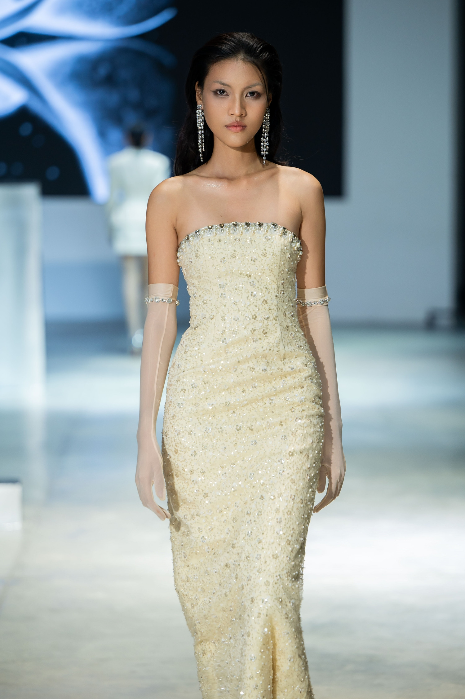 Huỳnh Tú Anh (dẫn đần) - Quán quân The Face Vietnam 2023 - thu hút ánh nhìn khi trình diễn thiết kế kết hợp giữa blazer (menswear, quyền lực) và chân váy đính lông vũ (mềm mại, nữ tính).