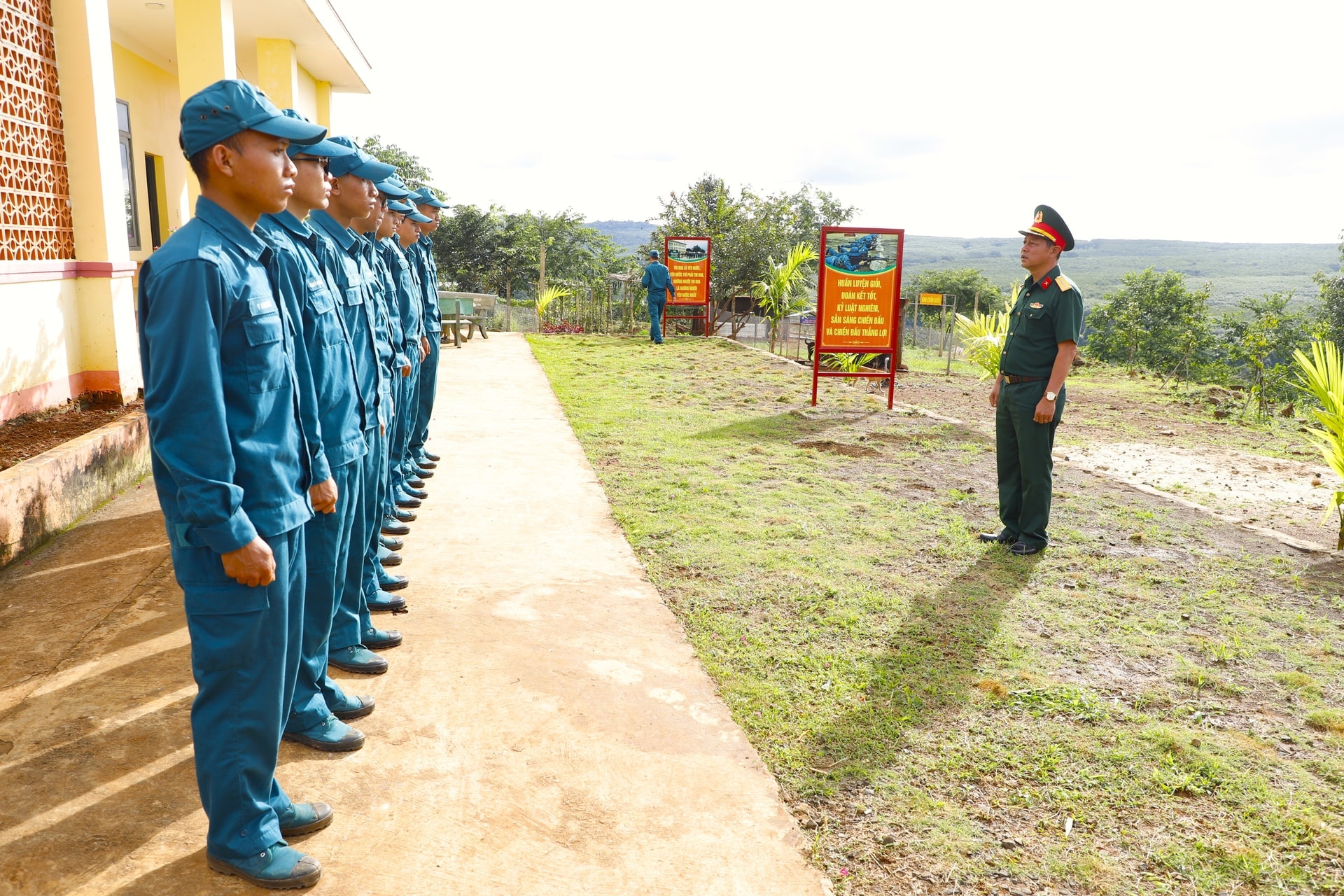 Thiếu tá Hoàng Quốc Tuấn hướng dẫn cho cán bộ, chiến sĩ chốt dân quân thường trực Đắk Lao, động tác đội hình