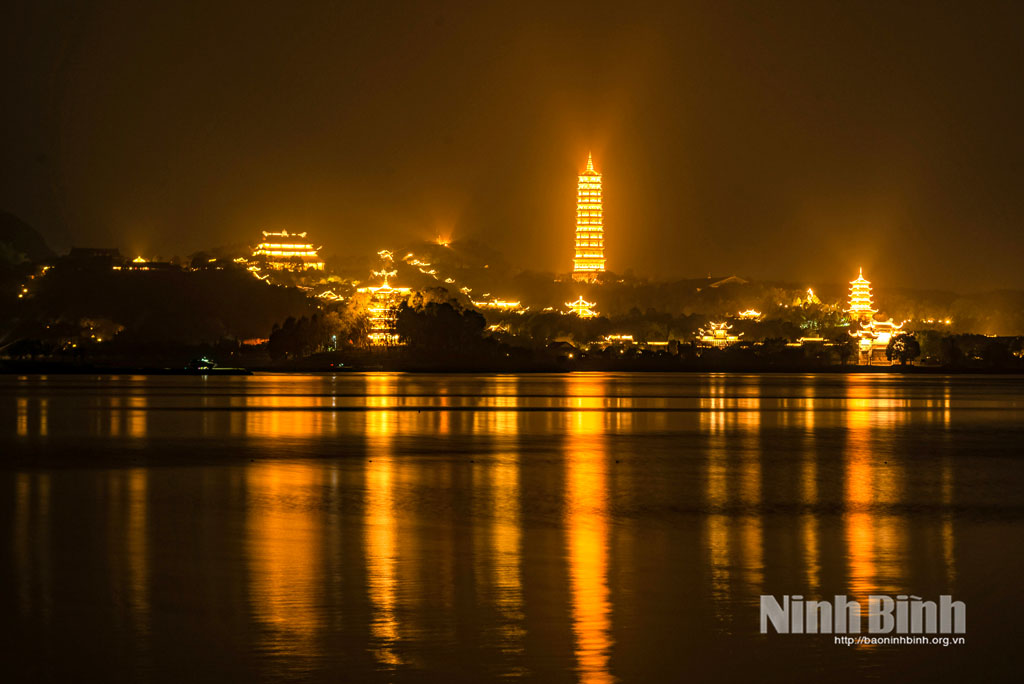 Giữa màn đêm tĩnh mịch, Chùa Bái Đính hiện lên lung linh như ngọn hải đăng tâm linh giữa núi non trùng điệp. Ảnh: Ngọc Linh