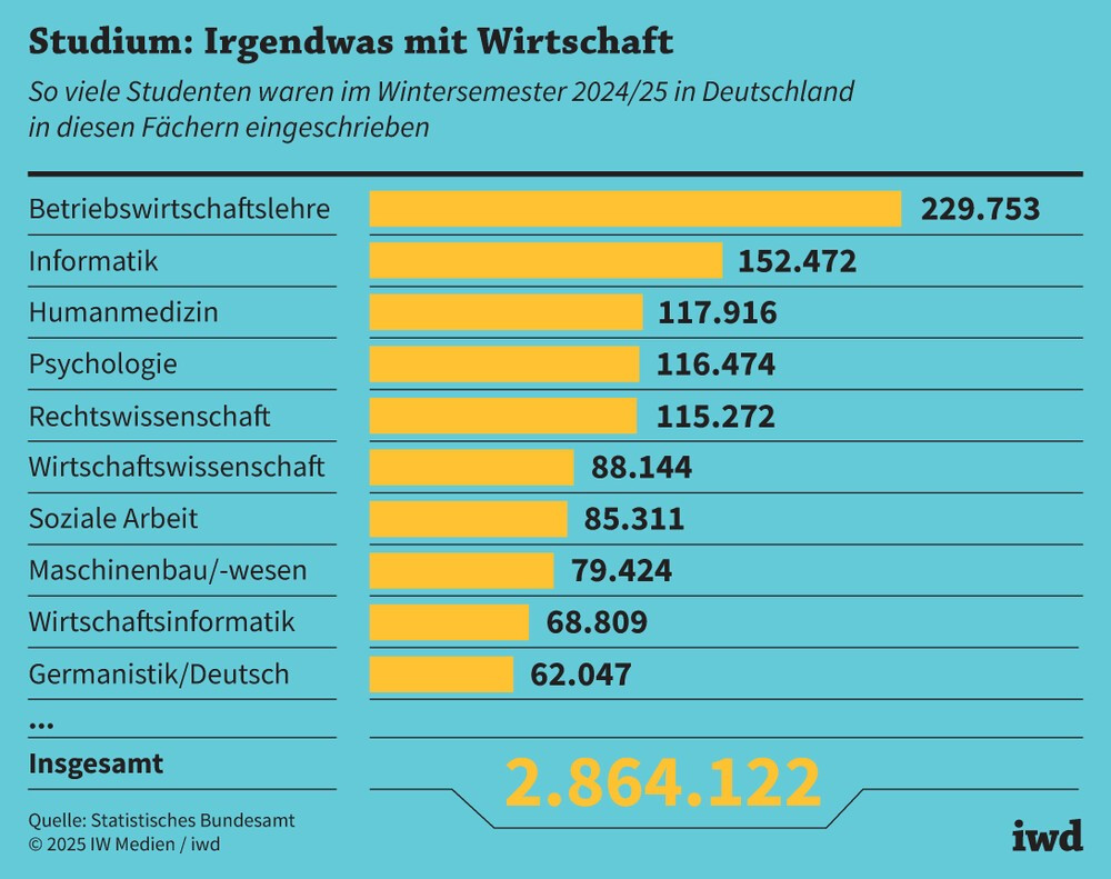 Theo số lượng thống kê giữa hơn 22.000 chương trình đào tạo đại học được cung cấp tại Đức, trong khi một số ngành học có ít hơn 10 sinh viên theo học trên toàn quốc, thì những ngành khác lại có hơn 200.000 sinh viên. Mặc dù nam và nữ có những sở thích học tập khác nhau, nhưng ngành học được lựa chọn nhiều nhất lại giống nhau đối với cả hai giới. Từ Hoạt hình 3D cho phim và trò chơi đến Kỹ thuật công nghệ cao... sự lựa chọn trong số gần 22.300 chương trình đào tạo tại Đức thực sự rất đa dạng. Tuy nhiên, trong vài năm trở lại đây, các ngành học liên quan đến kinh doanh luôn có nhu cầu cao. Với gần 230.000 sinh viên, tương đương 8% tổng số sinh viên đang theo học trên toàn quốc, Quản trị Kinh doanh là ngành học phổ biến nhất tại Đức trong năm 2025.