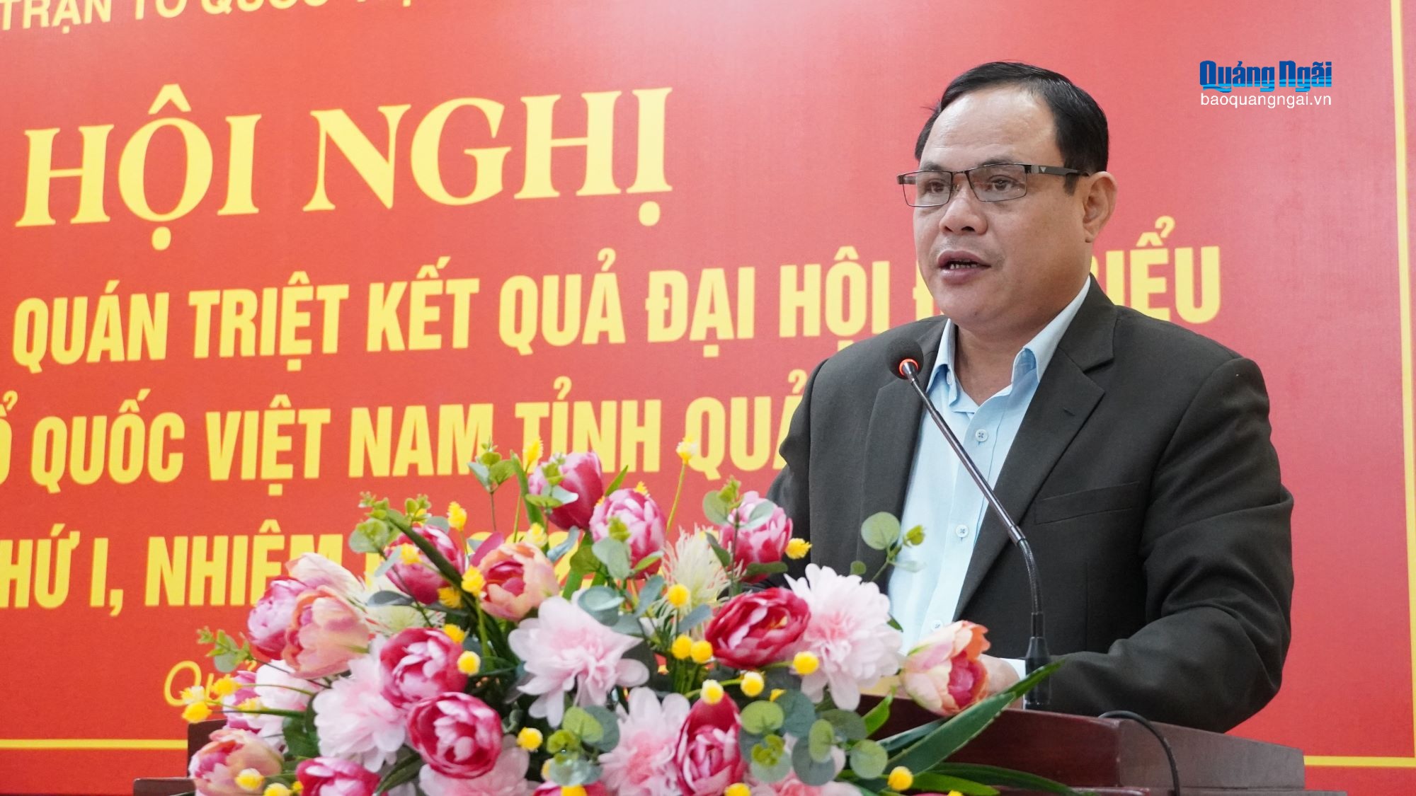 Tại hội nghị, Phó Chủ tịch Ủy ban MTTQ Việt Nam tỉnh Hồ Ngọc Thịnh báo cáo kết quả Đại hội đại biểu Mặt trận Tổ quốc Việt Nam tỉnh Quảng Ngãi lần thứ I, nhiệm kỳ 2025 - 2030. Theo đó, Đại hội đại biểu MTTQ Việt Nam tỉnh lần thứ I diễn ra trong 2 ngày 17 - 18/11 tại Trung tâm Hội nghị và Triển lãm tỉnh. Tham dự Đại hội có 287 đại biểu chính thức đại diện cho các tầng lớp nhân dân, dân tộc, tôn giáo trong tỉnh.