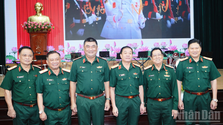 Đại tướng Nguyễn Trọng Nghĩa, Ủy viên Bộ Chính trị, Bí thư Trung ương Đảng, Ủy viên Thường vụ Quân ủy Trung ương, Chủ nhiệm Tổng cục Chính trị Quân đội nhân dân Việt Nam thăm hỏi cán bộ cao cấp quân đội nghỉ hưu, nghỉ công tác tại buổi lễ.