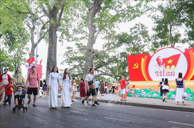 Du khách vui chơi tại khu vực phố đi bộ hồ Hoàn Kiếm. Ảnh: TTXVN