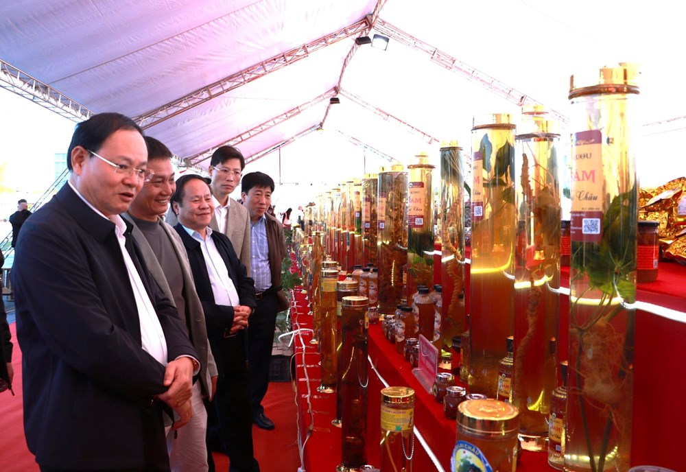 Bí thư tỉnh ủy Lai Châu Lê Minh Ngân và các đại biểu tham quan không gian trưng bày sản phẩm Ocop đặc trưng.