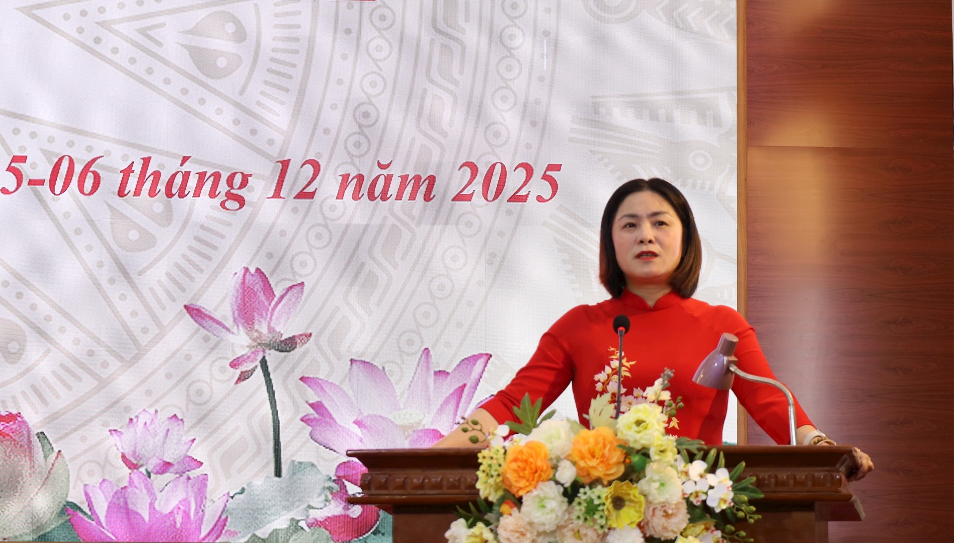 Phó Chủ tịch UBND xã Quảng Bị Tô Thị Đào báo cáo tình hình phát triển kinh tế, xã hội năm 2025, phương hướng, nhiệm vụ năm 2026. Ảnh: Kim Nhuệ