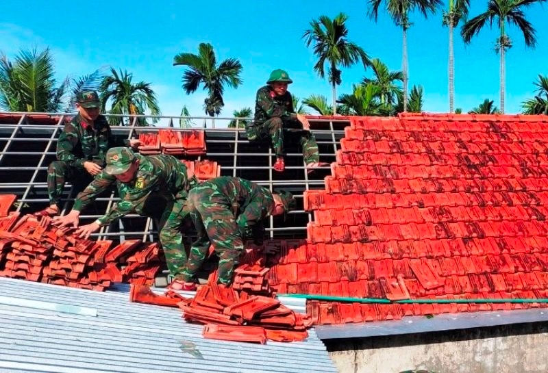 Lực lượng Quân đội giúp người dân lợp lại mái nhà sau khi bão số 13 gây tốc mái.