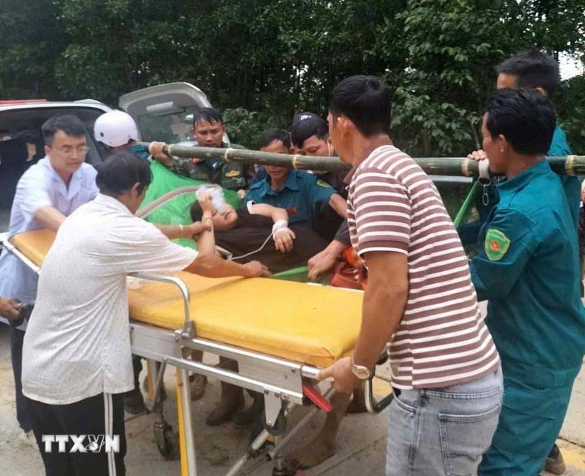 Sản phụ được khiêng từ vùng cô lập đến cơ sở y tế. (Ảnh: TTXVN phát)