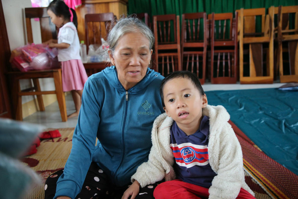 Bà Đặng Thị Thanh cùng cháu tại khu sơ tán tránh bão số 13. Ảnh: Tấn Thành.