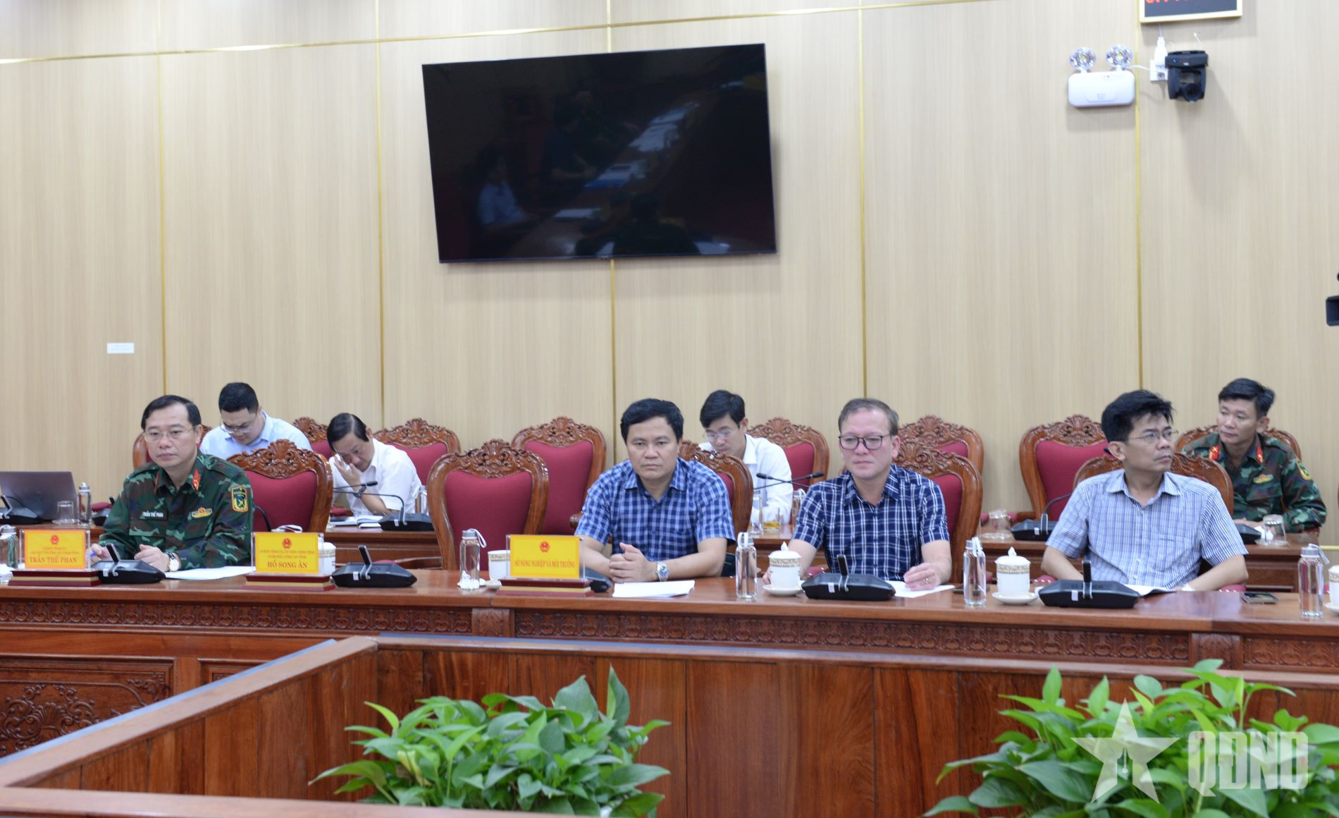 Thượng tướng Phạm Trường Sơn, Phó tổng Tham mưu trưởng Quân đội nhân dân Việt Nam (trái) dự hội nghị trực tuyến tại điểm cầu UBND tỉnh Quảng Ngãi.