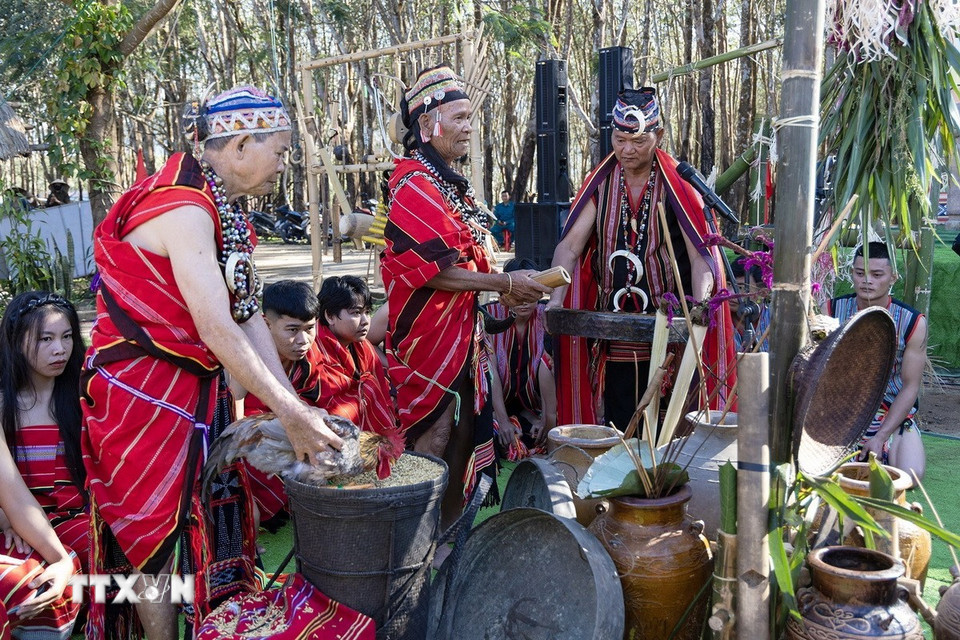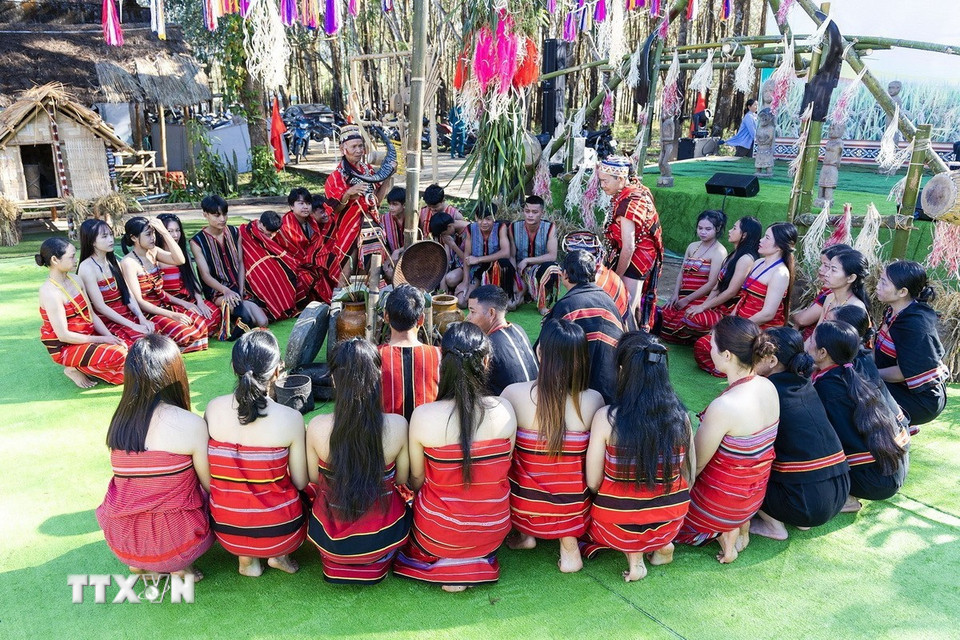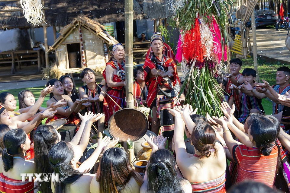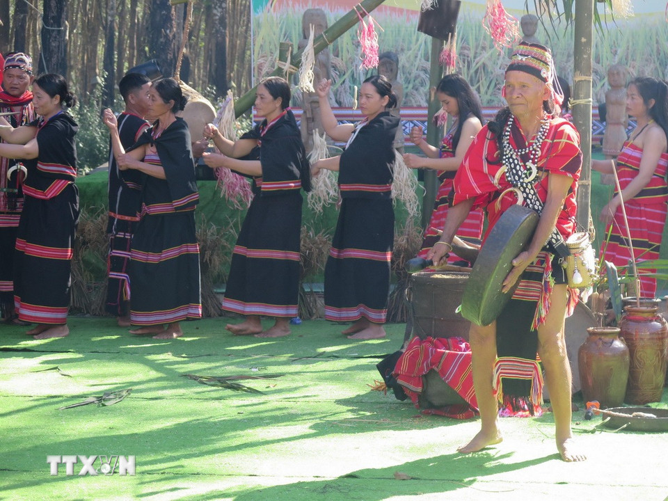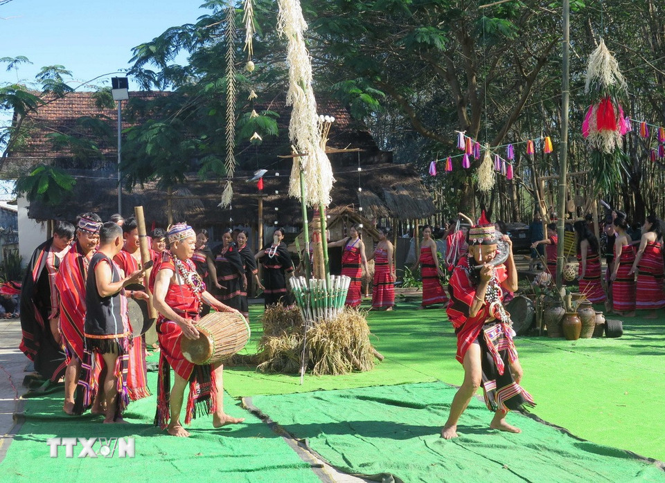 Việc phục dựng Lễ mừng lúa mới của dân tộc Giẻ Triêng, nhằm mục tiêu bảo tồn, gìn giữ những giá trị văn hóa của nghi lễ đặc trưng này, trong bối cảnh có nguy cơ bị mai một theo thời gian. (Ảnh: Dư Toán/TTXVN)