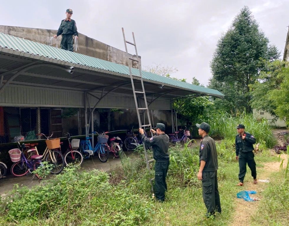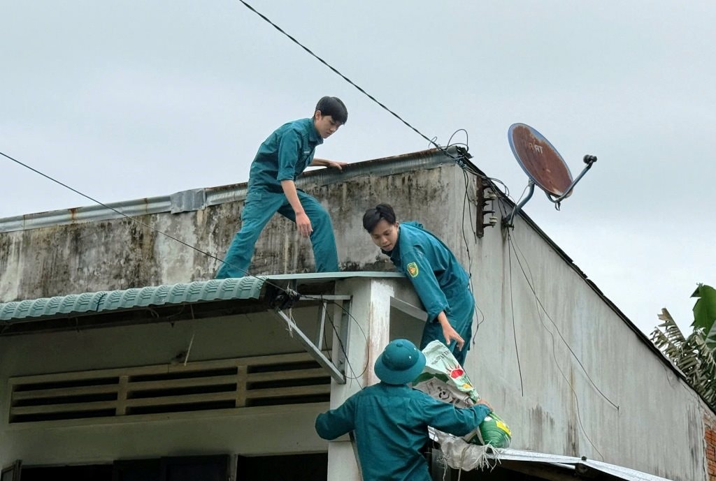 Lực lượng dân quân giúp người dân chằng chống nhà cửa